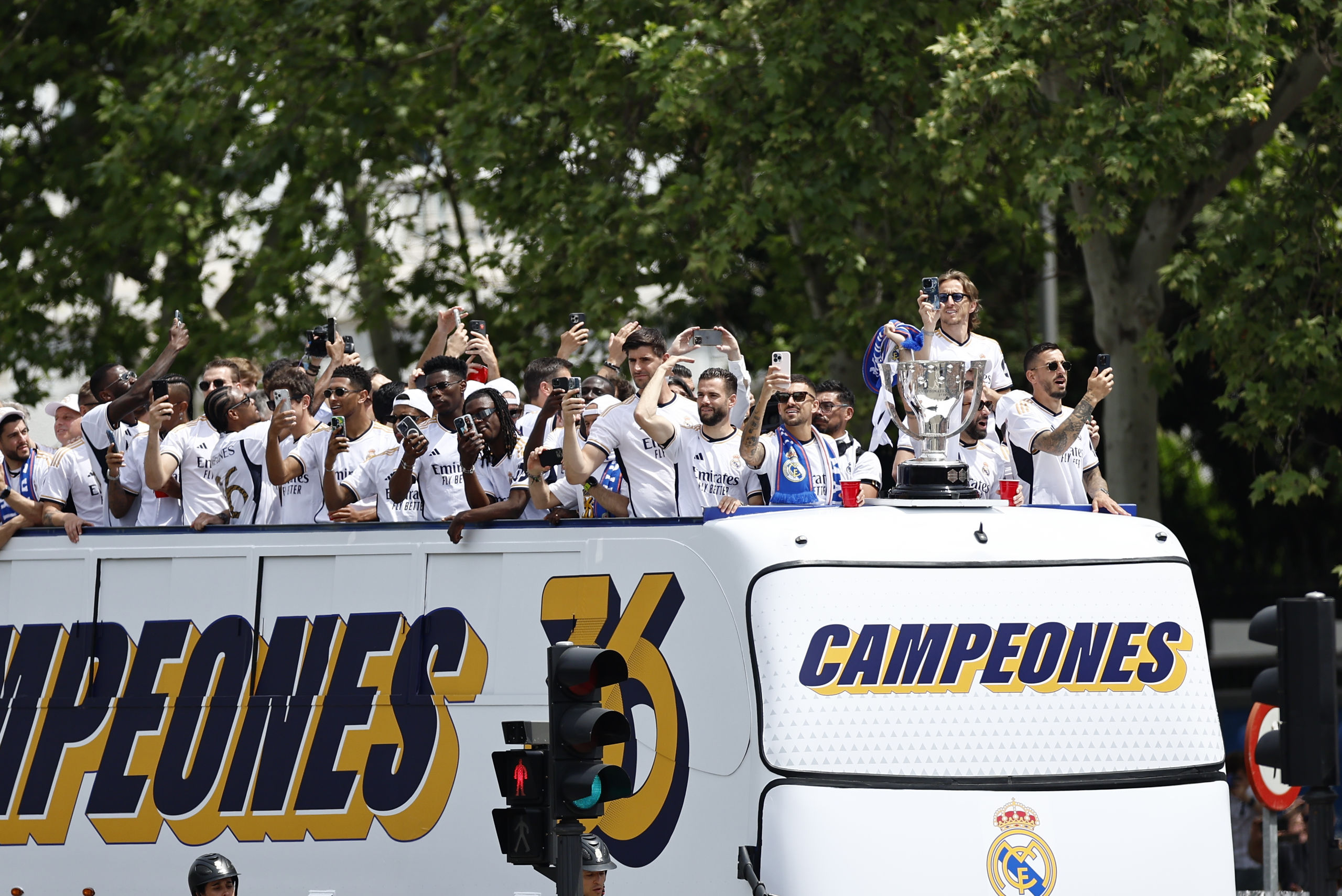 Como es habitual, el Real Madrid llegó en el bus descapotable de los campeones. La Liga lideraba la comitiva.