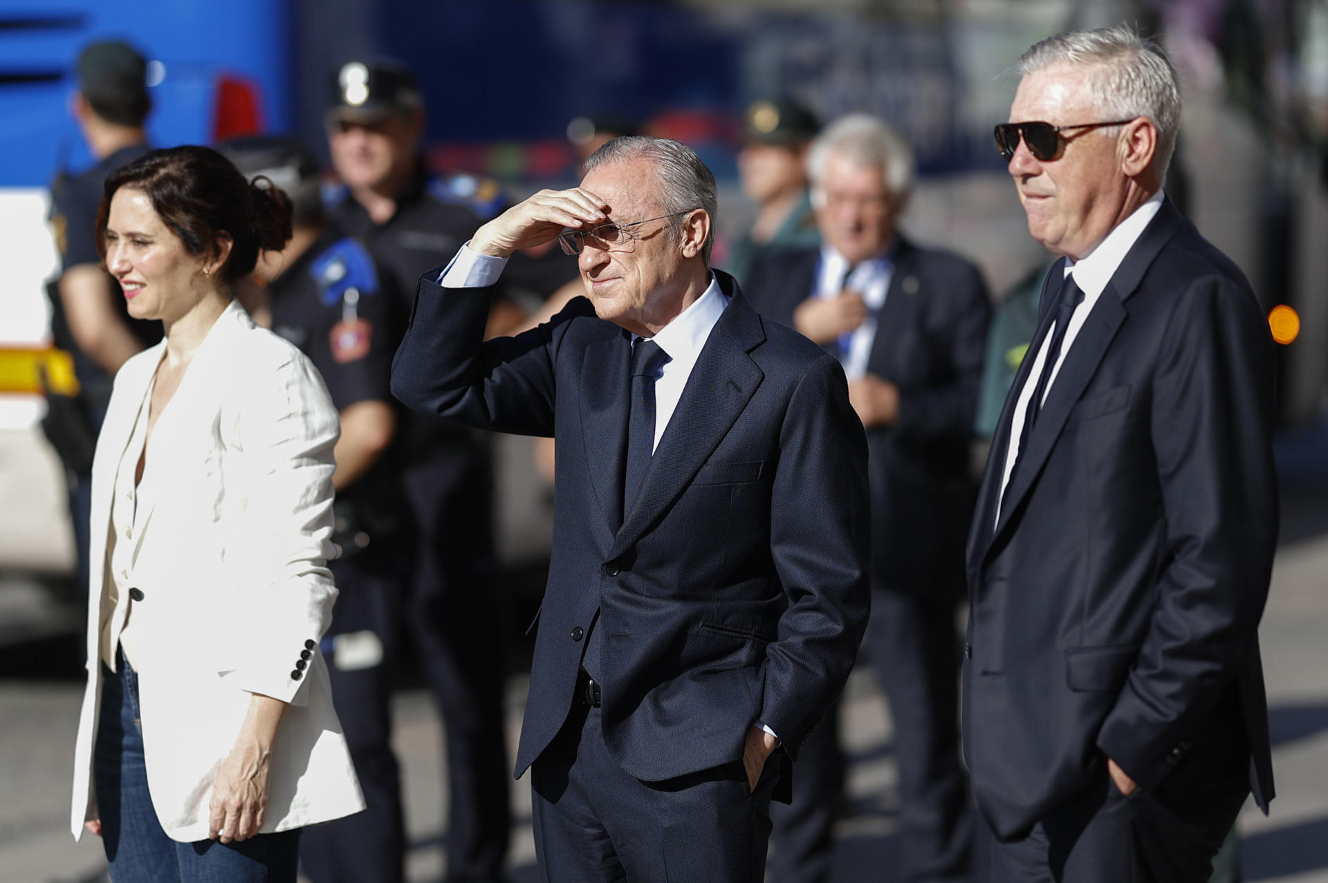 La presidenta de la Comunidad, Isabel Díaz Ayuso, junto a Florentino Pérez y Ancelotti. Este último con sus míticas gafas de sol.