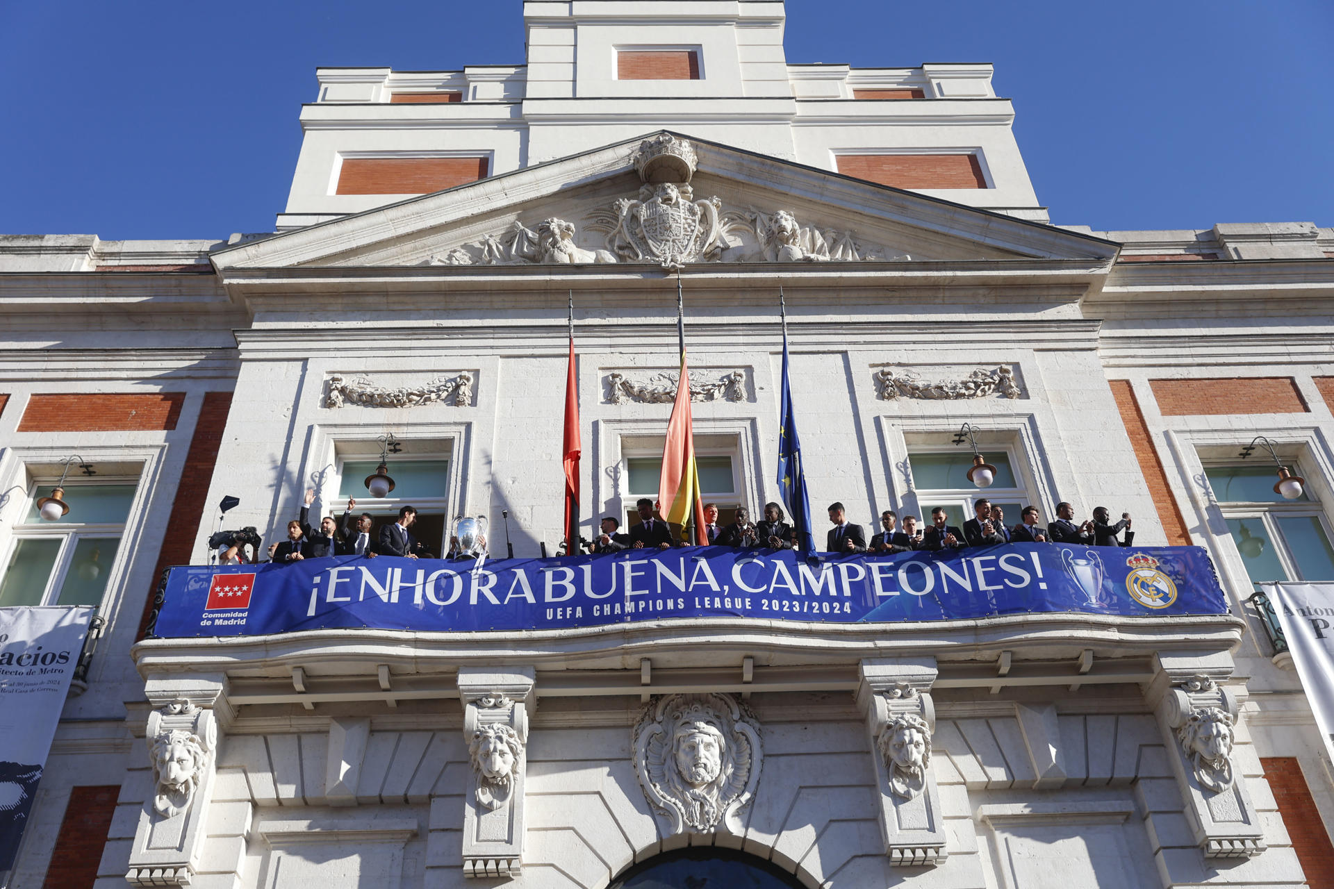 La plantilla saludó a los aficionados que se dieron cita en Sol. Cánticos para el rey de Europa en un día soleado en Madrid.