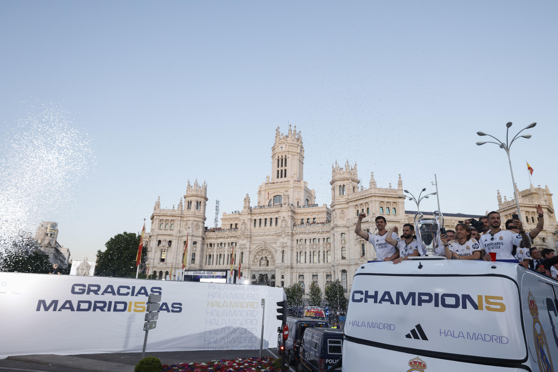 Al autobús del Real Madrid llegó a Cibeles aún con la luz del día. El equipo enloqueció con la presencia de miles de seguidores blancos.