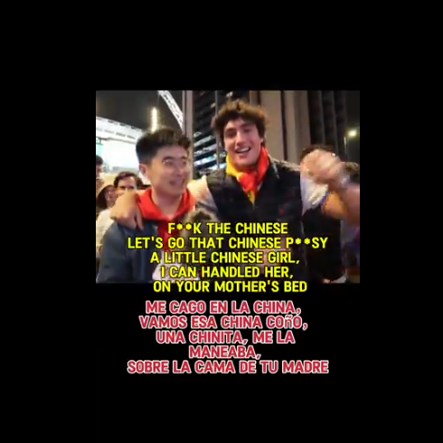 En el vídeo se puede ver a dos aficionados blancos cantándole una canción al reportero: "Una chinita me la meneaba, sobre la cama de tu hermana". La embajada china considera este cántico y otros comentarios "insultantes hacia China, vulgares y de mala naturaleza". El vídeo fue grabado por el usuario chino Qiumhu y fue subido a Tik Tok, que en su vídeo menciona la palabra "racismo" cuando se refiere a los cánticos y comentarios que tiene que escuchar en muchas ocasiones cuando realiza este tipo de entrevistas.