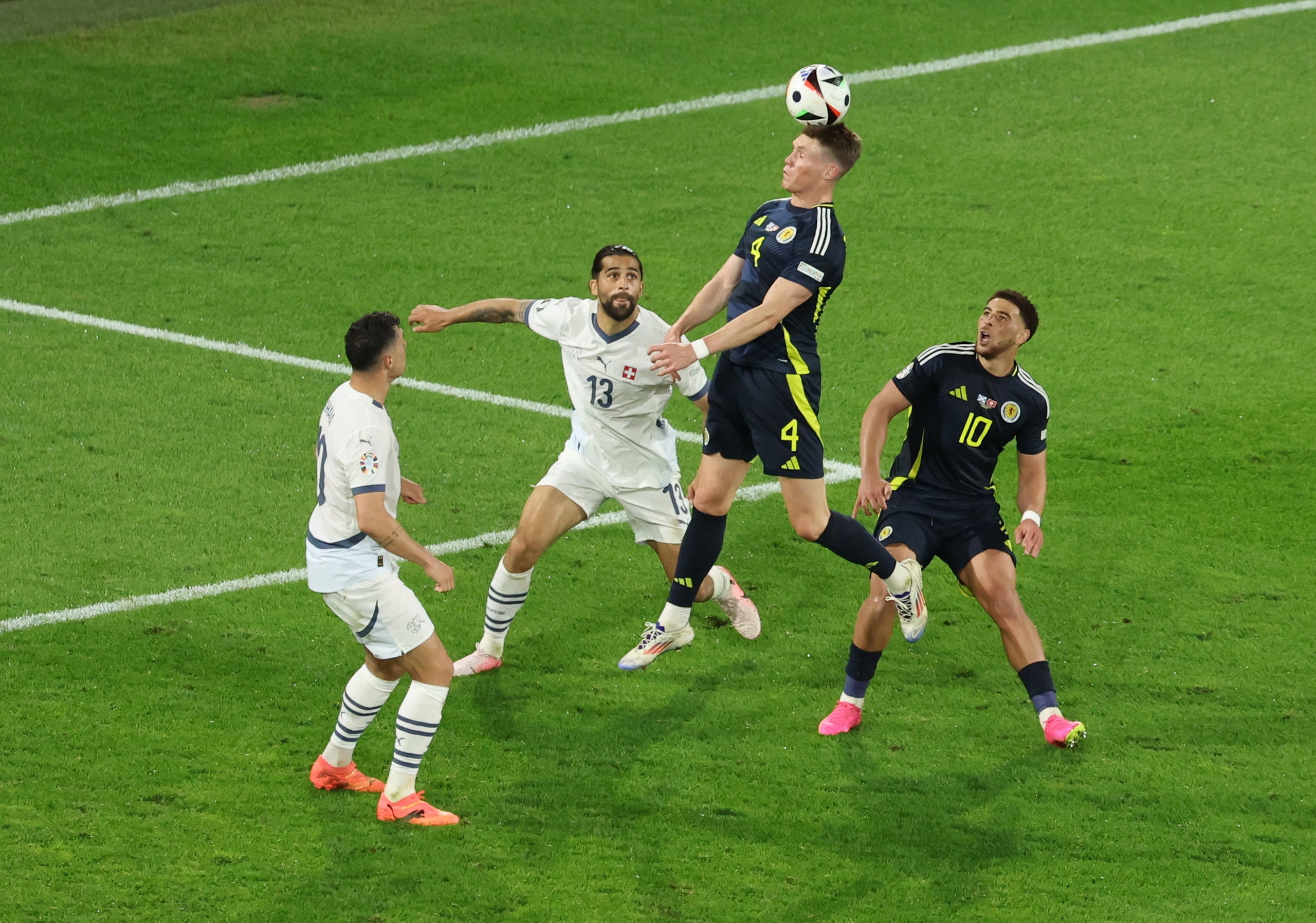 Lastrada por la goleada de Alemania en la primera jornada, Escocia renació en el choque de este miércoles, por delante rápidamente. Su contragolpe fue vertiginoso. De un ataque de Suiza, con un centro al área, surgió una salida imparable del equipo se Steve Clarke, conducido por Andy Robertson, que atravesó casi todo el campo, la cedió a McGregor, que vio a McTominay. El centrocampista del Manchester United, revelado como goleador imparable ya en la fase de clasificación, remató en su llegada al área. No era nada del otro mundo su disparo, probablemente a las manos de Yann Sommer, de no haber intervenido decisivamente Schär. Su mal despeje terminó de introducir el balón en su portería. Minuto 13.