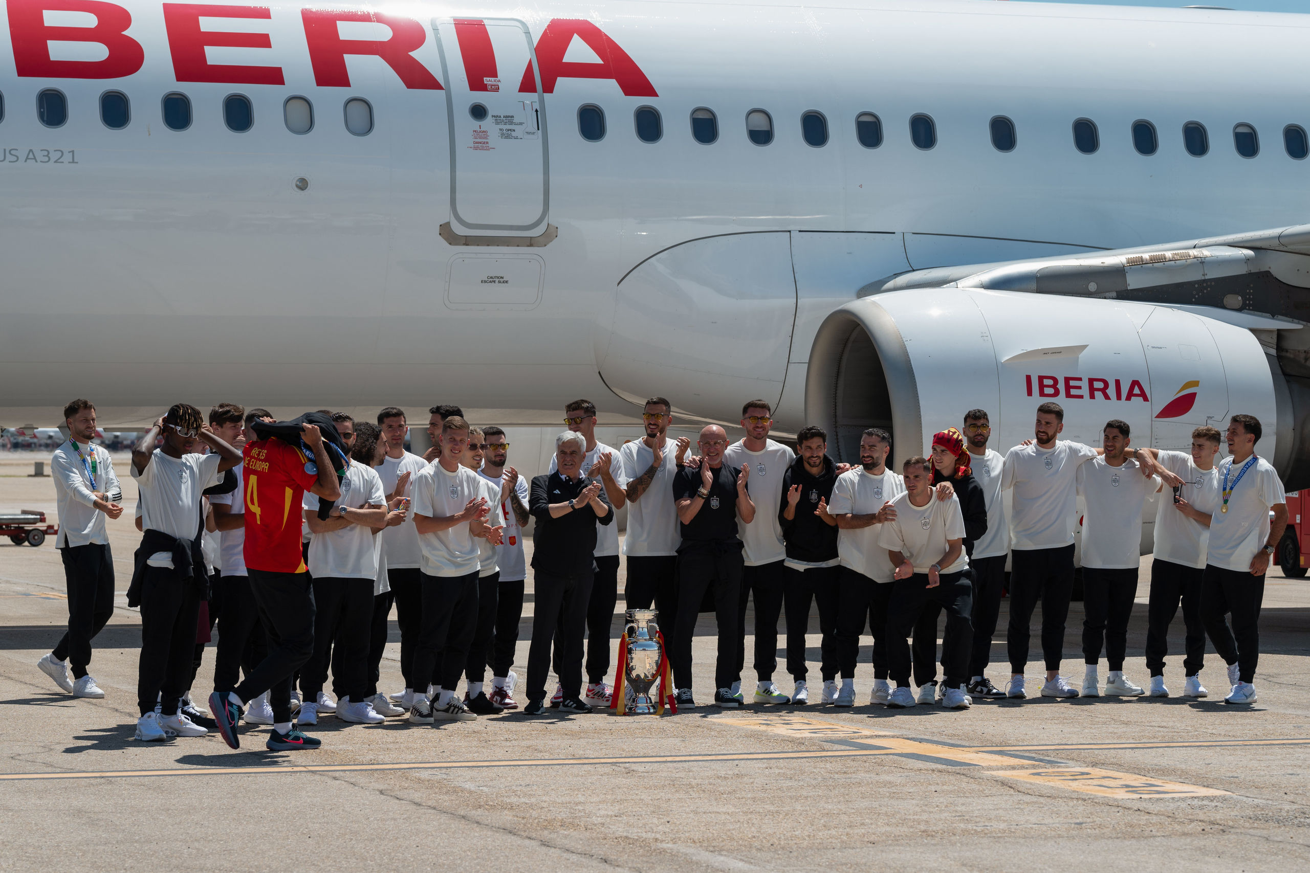Los componentes de la selección, junto al avión que los ha trasladado desde Berlín.