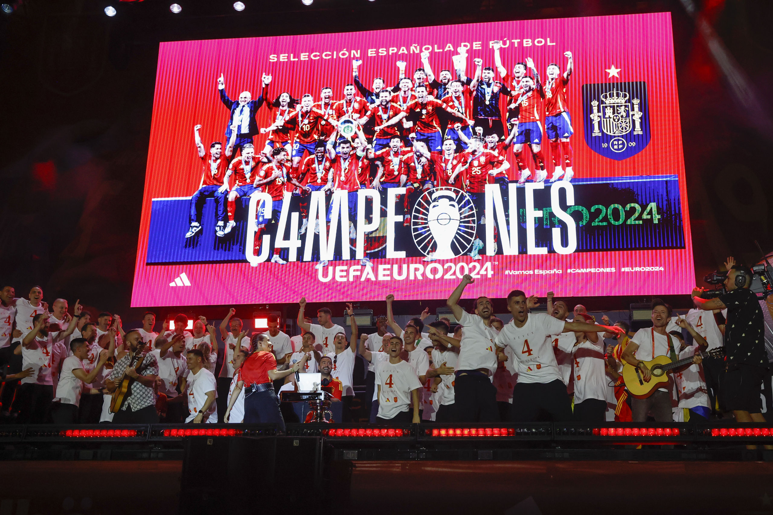 Miles de aficionados se concentran en la Plaza de Cibeles para celebrar el título de la Eurocopa junto a los jugadores y los miembros del cuerpo técnico, encabezado por Luis de la Fuente.