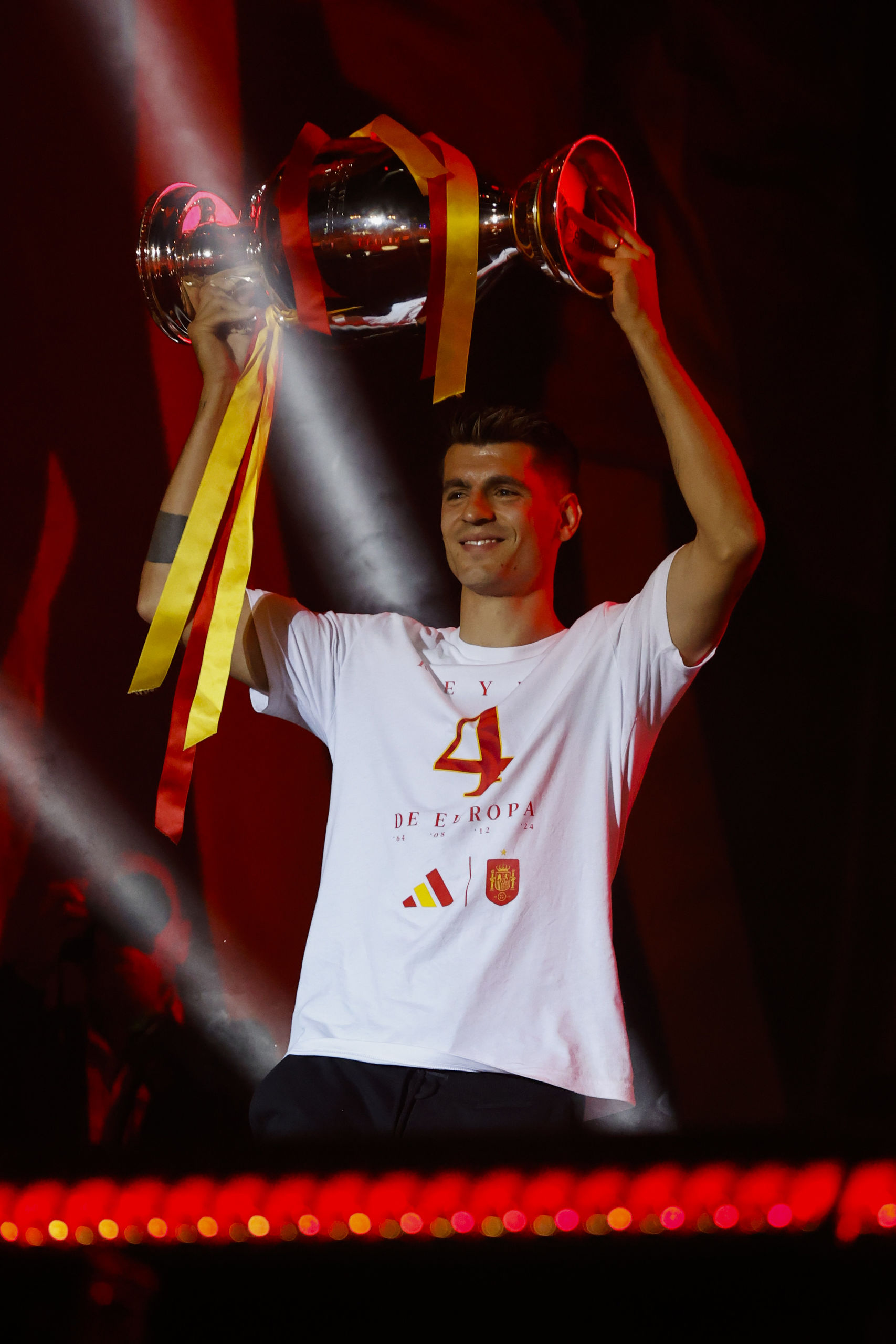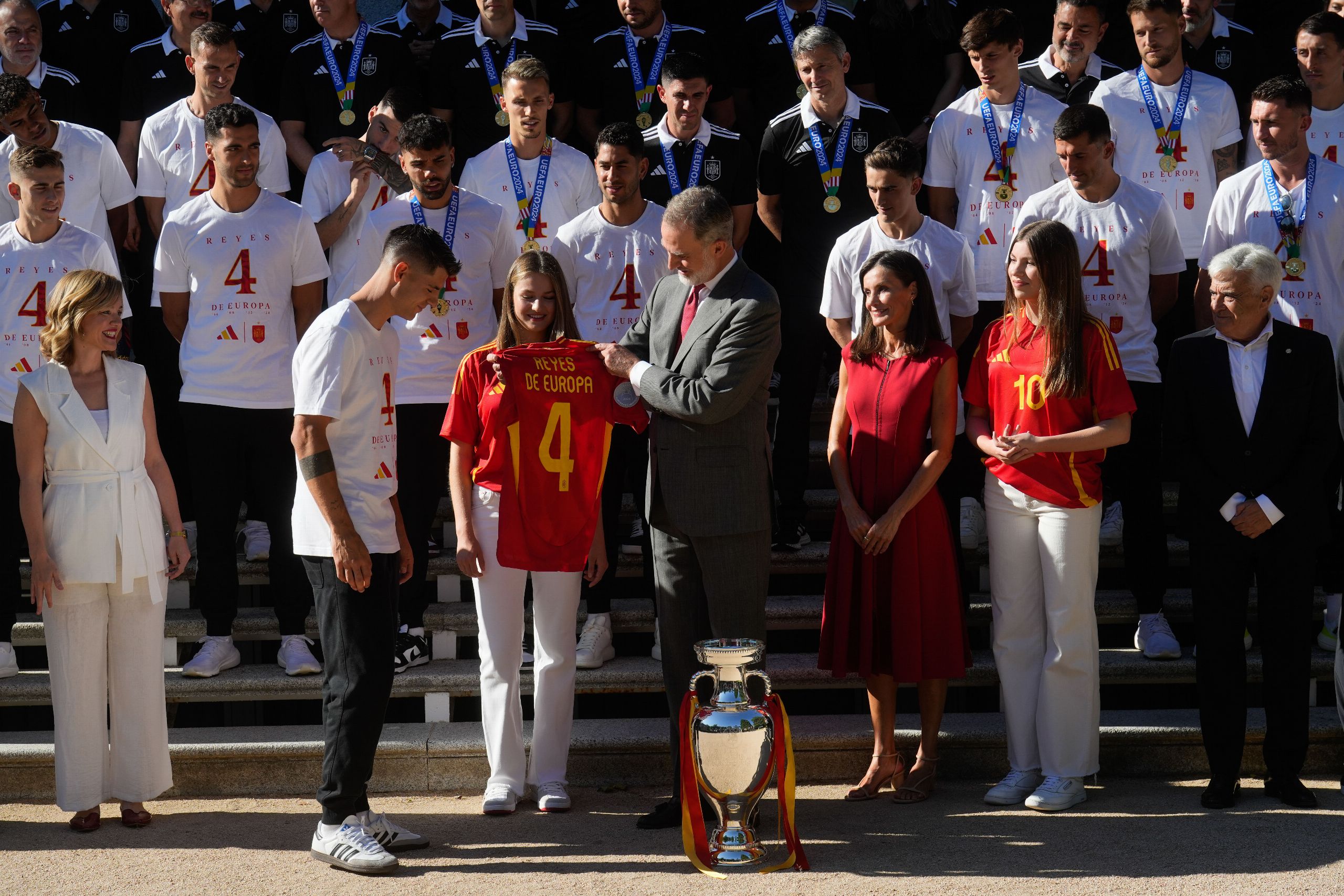 Álvaro Morata, capitán de la selección española, entrega al rey Felipe VI una camiseta conmemorativa de la cuarta Eurocopa de España, con el lema ‘Reyes de Europa’.