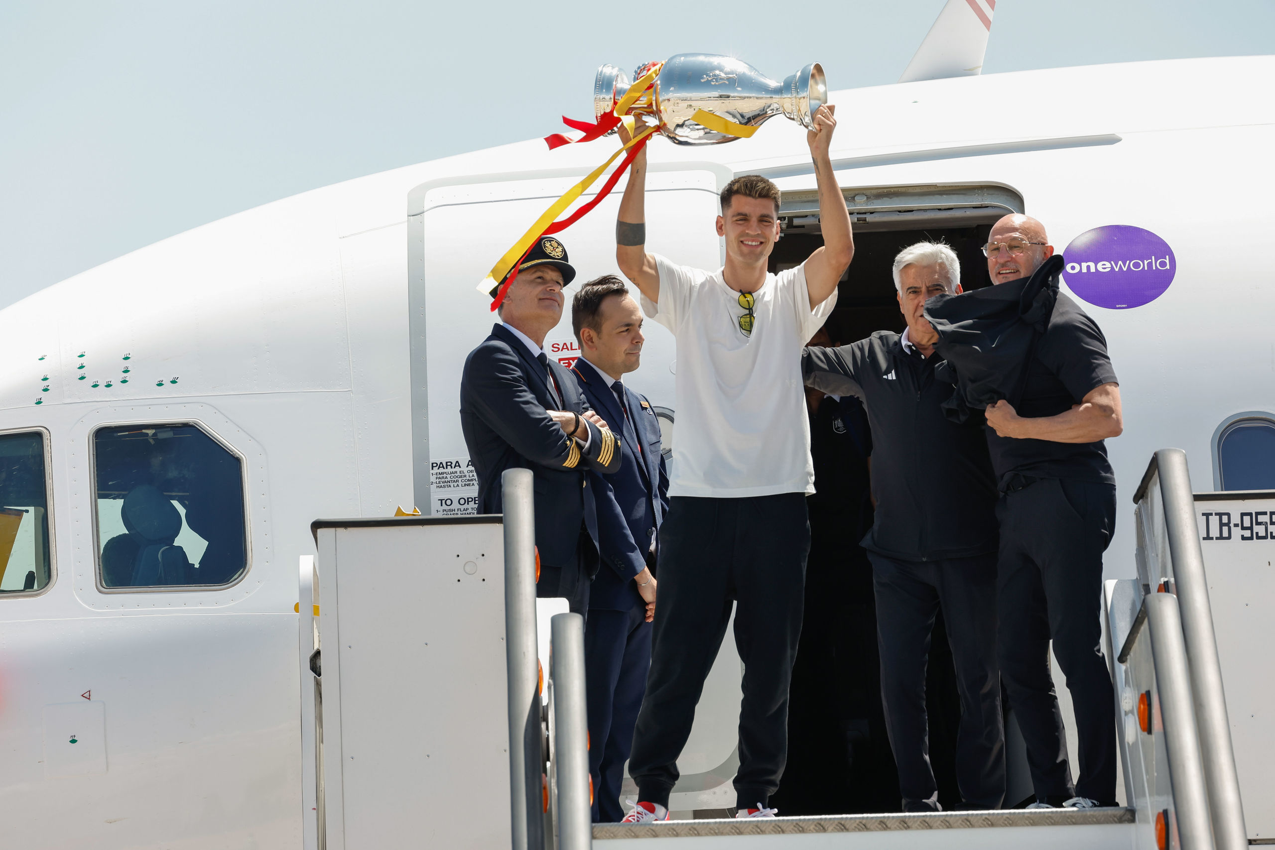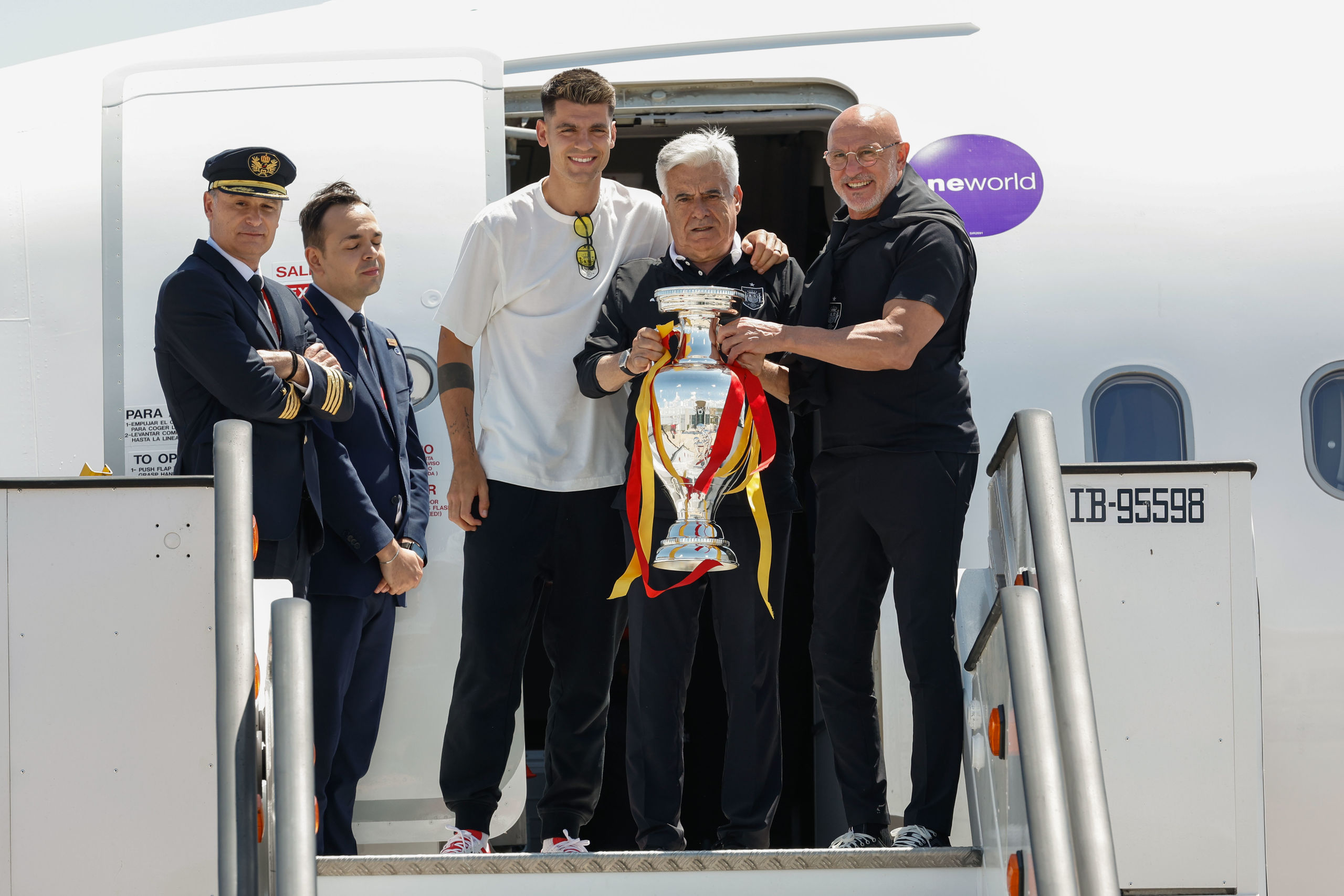 Álvaro Morata, Luis de la Fuente y Pedro Rocha, con el trofeo de la Eurocopa en el aeropuerto de Barajas.