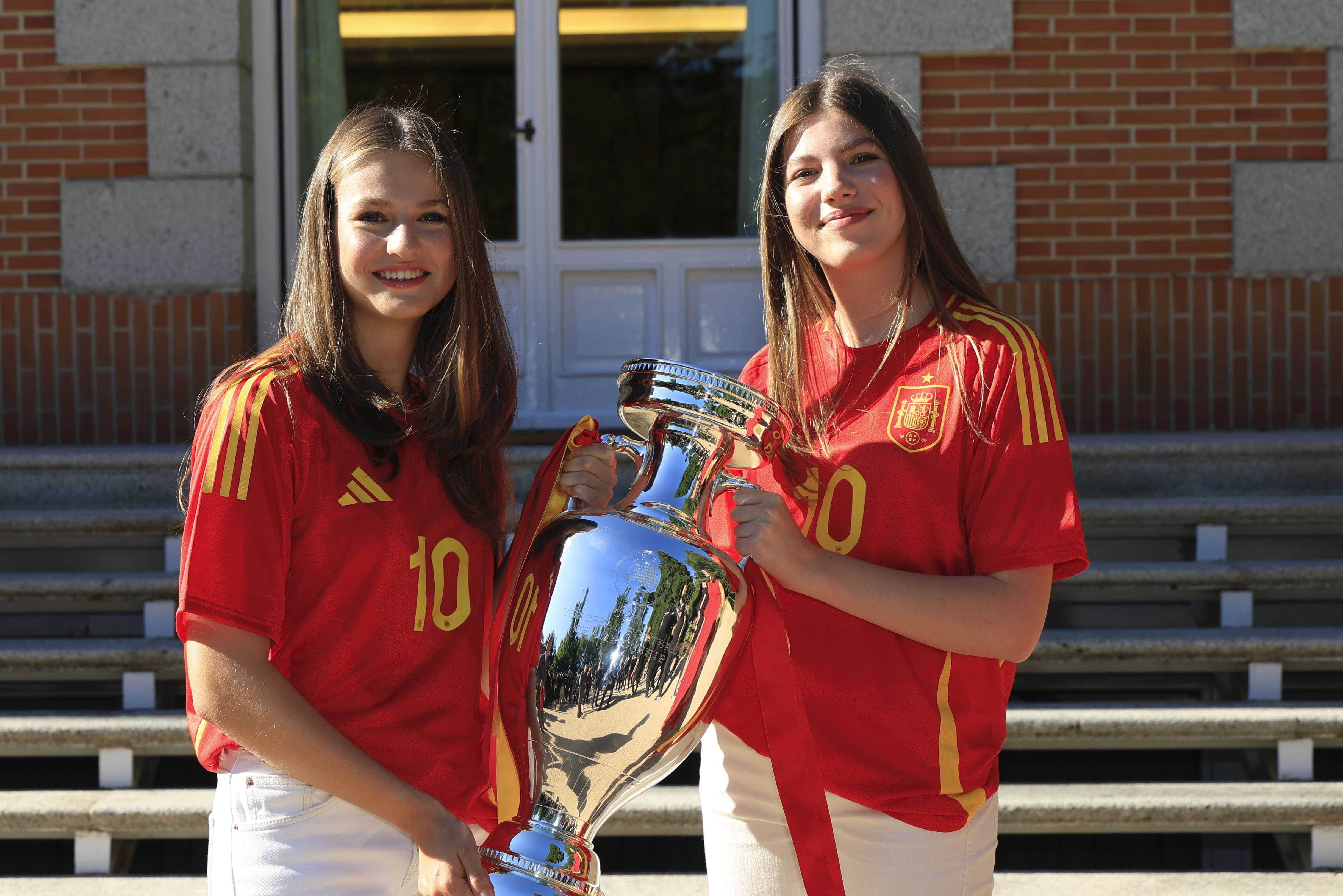 La princesa Leonor y la infanta Sofía posan con el trofeo de campeones de la Eurocopa.