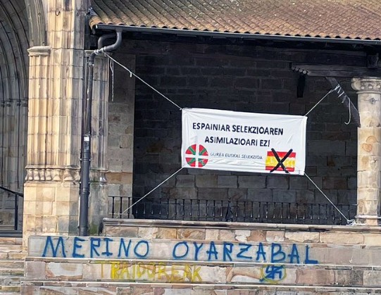 Este pasado sábado, en la previa de la victoria de España ante Inglaterra en el Estadio Olímpico de Berlín para conquistar la cuarta Eurocopa de su historia, la localidad de Elorrio (Vizcaya) amaneció con una polémica pancarta. En ella se leía, en euskera, el mensaje 'No a la asimilación de la Selección española' y dos pintadas con los nombres de Mikel Merino y Mikel Oyarzabal, ambos futbolistas de la Real Sociedad que juegan en el combinado nacional, junto a la palabra "traidores".