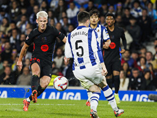 Era el minuto 12 de partido cuando Frenkie de Jong, con una muy buena internada, sacó un potente tiro que acabaría siendo despejado hasta en dos ocasiones por la defensa donostiarra. Primero fue Aguerd quien sacó el balón con la rodilla; cuando el rechace quedó muerto, Zubeldia fue quien metió la cabeza y acabó dejando el balón a placer para Lewandowski, quien, con una especie de media tijereta, acabaría dejando un golazo que finalmente no subiría al marcador.