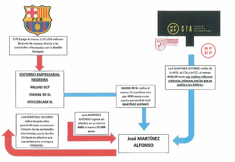 "Asimismo", continúa, "se ha observado que, durante el periodo comprendido entre los años 2013 a 2018, el señor José María Enríquez Negreira y su entorno establecieron una operativa financiera inusual, ajena al tráfico mercantil habitual que consistió en interponer entre el FCB y el entramado societario de los Enríquez, la figura de José Contreras como administradas por el Sr. Molinaro, ejerciendo funciones de testaferro, con la intermediario a través de sociedades pretensión de desvincular sus respectivos nombres de la operativa, aun manteniendo sus relaciones. El Sr. Contreras ostentó, según la página oficial del FCB, un puesto como directivo en el FC Barcelona bajo la presidencia del Sr. Bartomeu, lo que podría haber facilitado el común acuerdo de llevar a cabo este modus operandi".