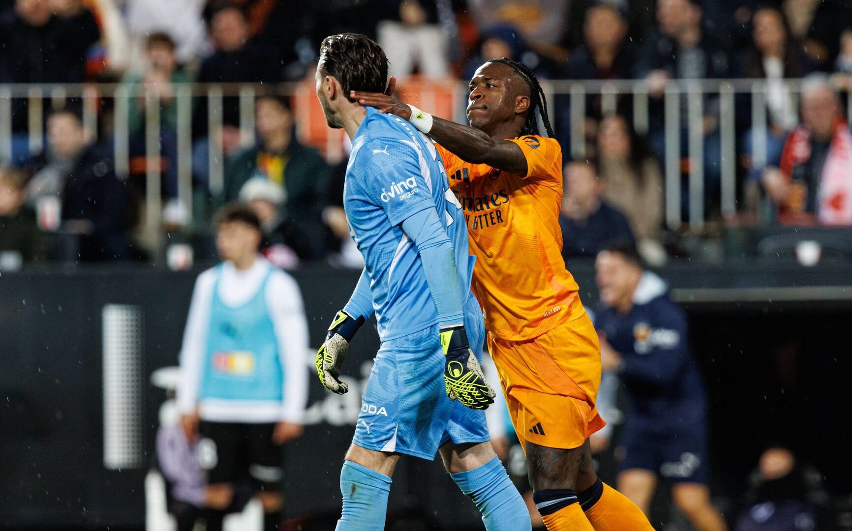 Vinícius Junior fue expulsado este viernes contra el Valencia, en el partido de LaLiga EA Sports que el Real Madrid ganó en Mestalla (1-2) y que tuvo que ser aplazado en su día por los terribles efectos de la DANA, después de propinar un empujón al portero rival Stole Dimitrievski, siendo después sujetado entre sus protestas, tal y como recoge el acta arbitral.