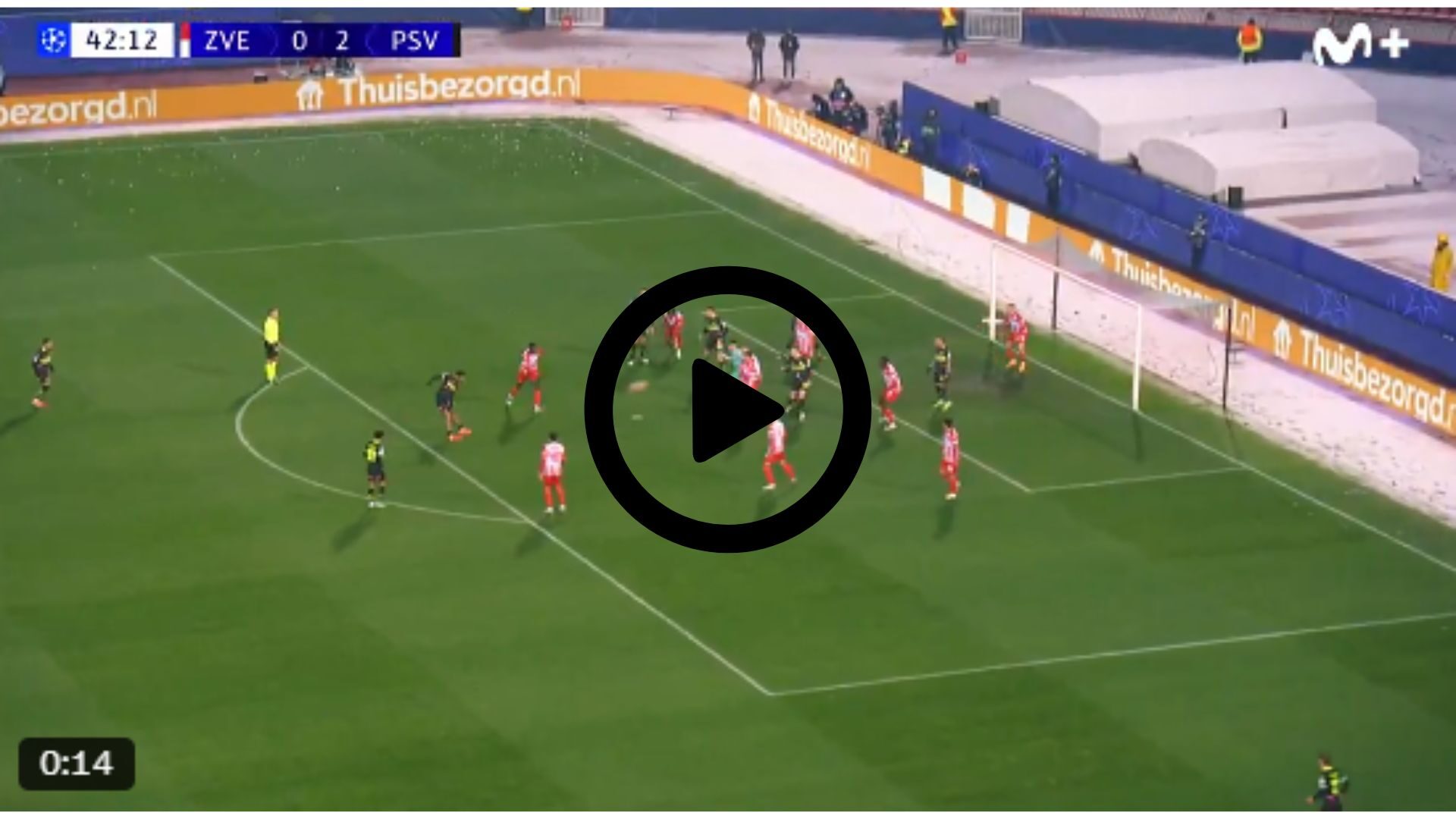 La acción del gol vino precedida de un centro de Veerman al que el portero del Estrella Roja sale muy lejos de la portería, no termina de despejar y es la propia cabeza de Til, jugador del PSV, la que le deja, prácticamente sin querer, un balón franco a Flamingo, quien suelta una potente y letal volea desde la frontal del área para acabar marcando un golazo con todos los rivales que tenía delante tapándole el tiro.