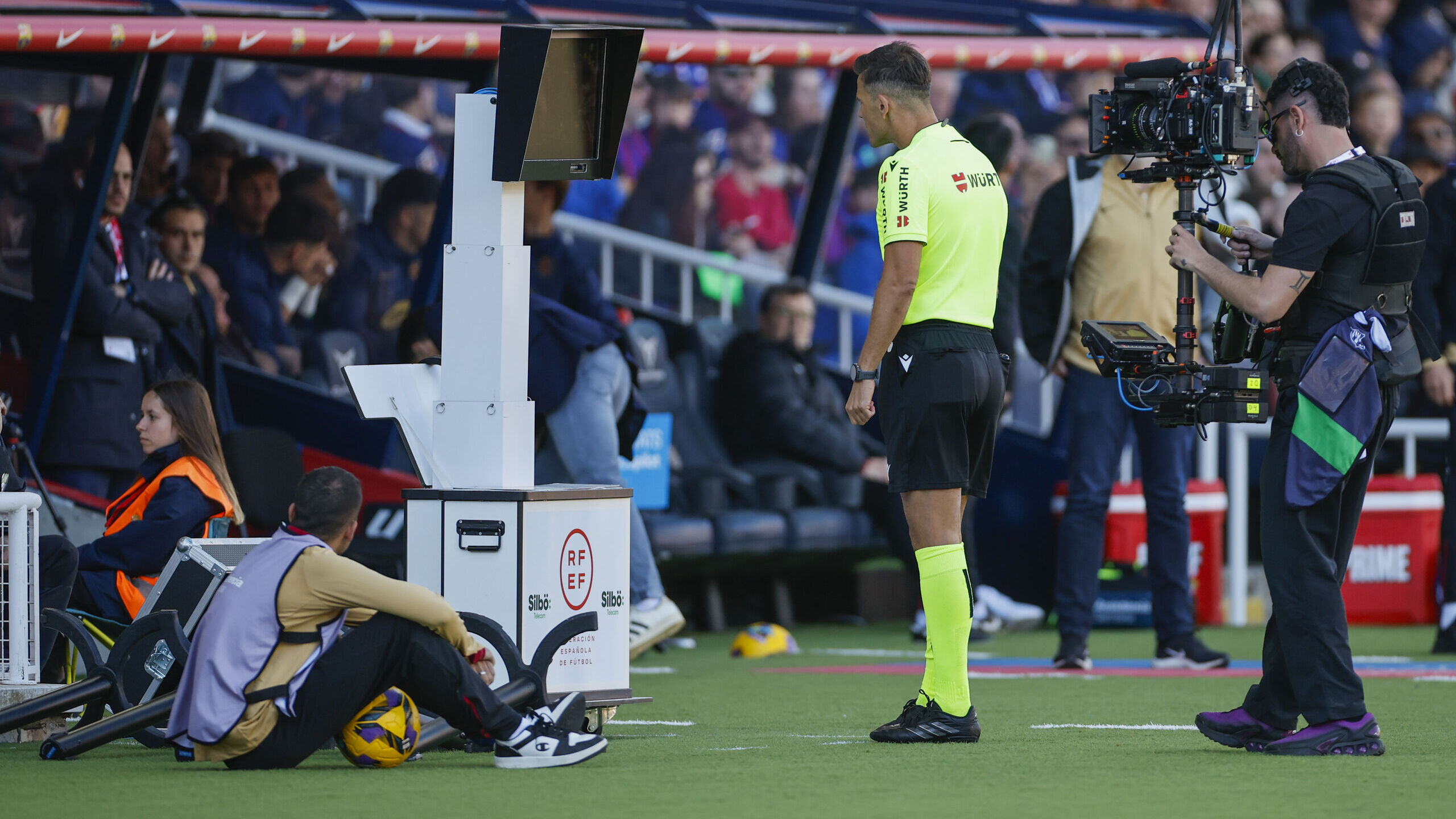 En esta ocasión, Estrada Fernández estaba sorprendido con el audio del VAR durante una acción en la que se vieron implicados Fermín López y Yáser Asprilla. Pulido Santana pitó una falta al borde del área del colombiano sobre el centrocampista culé, pero posteriormente retrocedió en la decisión. Desde el VAR, Jorge Figueroa Vázquez llamó al colegiado para que acudiese al monitor para revisar la jugada y comprobar si la falta se había producido fuera del área o podía señalarse la pena máxima. Finalmente, Pulido Santana señaló falta del Fermín sobre Asprilla.