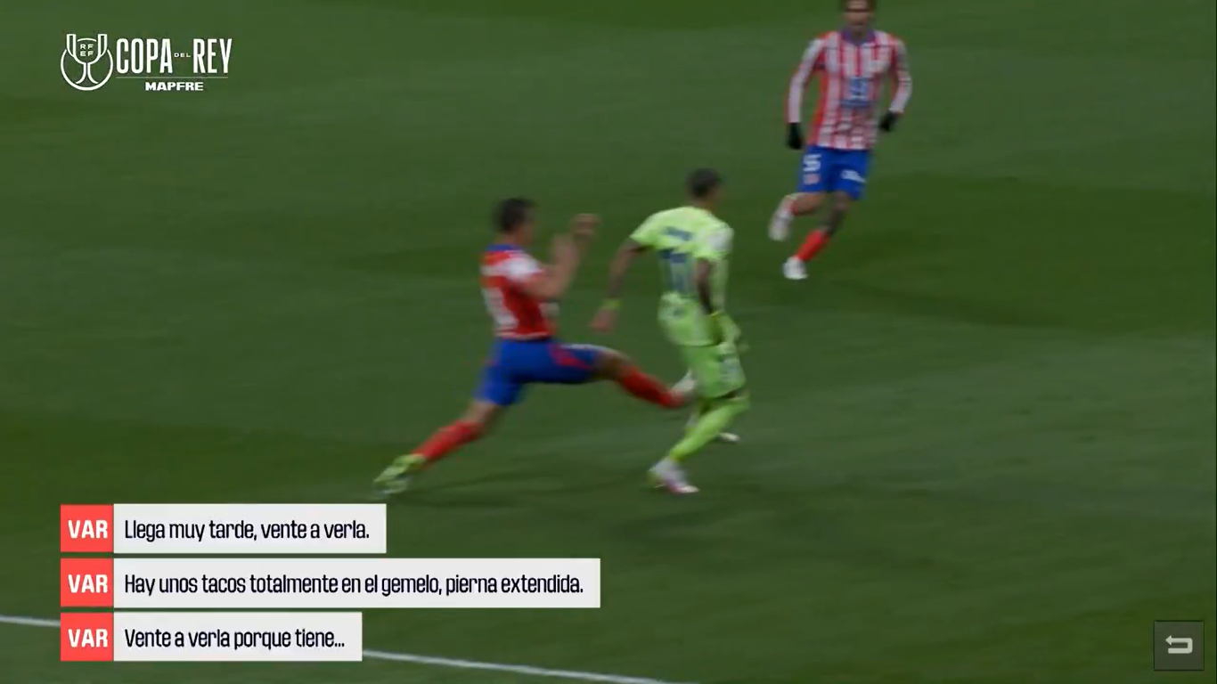 "José, vente a verla. José, escucha, vente a verla. Vente a verla porque tiene... Hay unos tacos en el gemelo, pierna extendida. Llega muy tarde tío", le dice el árbitro VAR, Martínez Munuera.