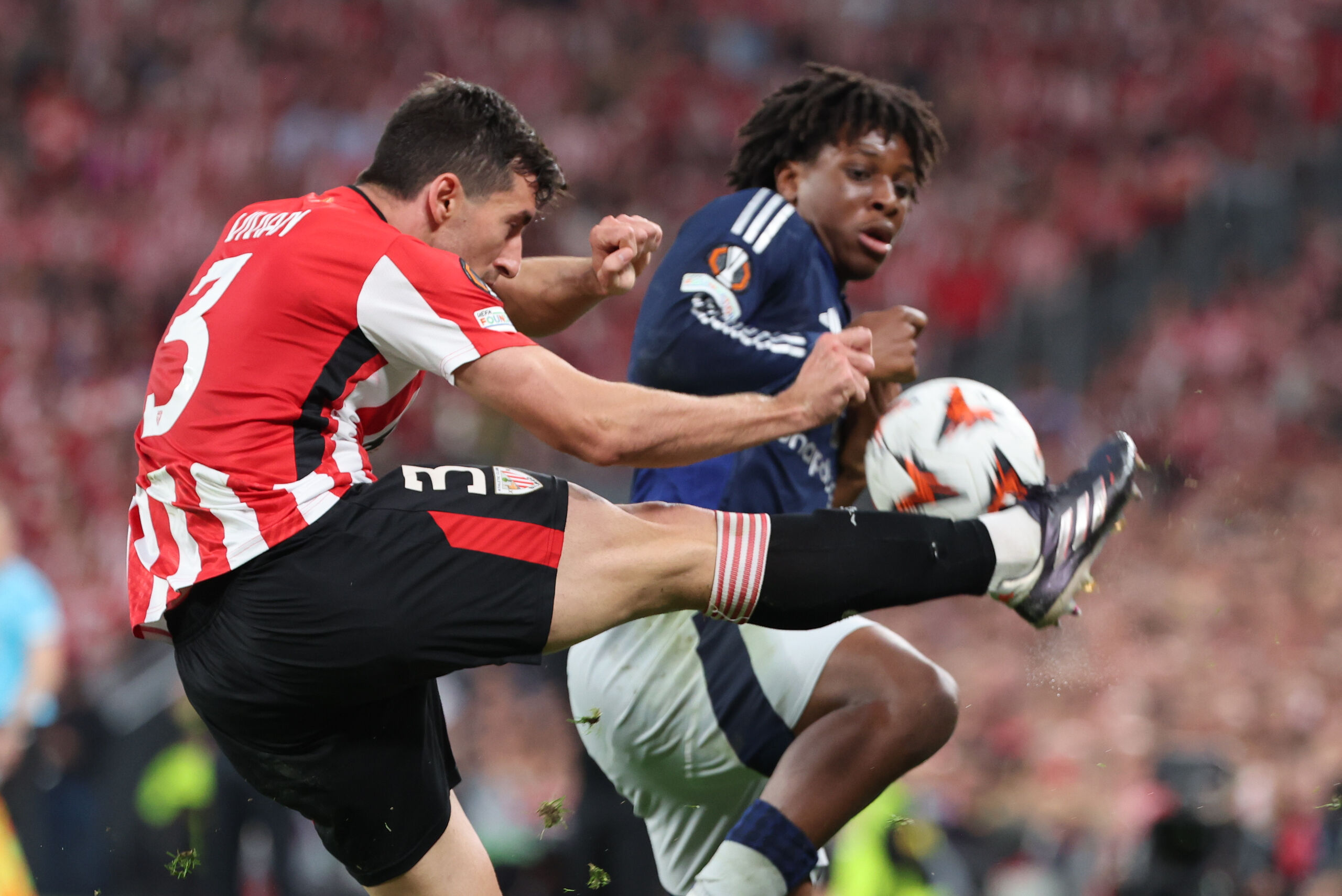 En una jugada en la que el central vasco sujetó a Rasmus Hojlund cuando se disponía a rematar un centro de Mazraoui, el colegiado Espen Eskas no señaló nada en un principio. Tras el aviso desde el VAR, el trencilla del choque en San Mamés fue a mirar la jugada al monitor y allí señaló el penalti y la expulsión ante la incredulidad del zaguero.