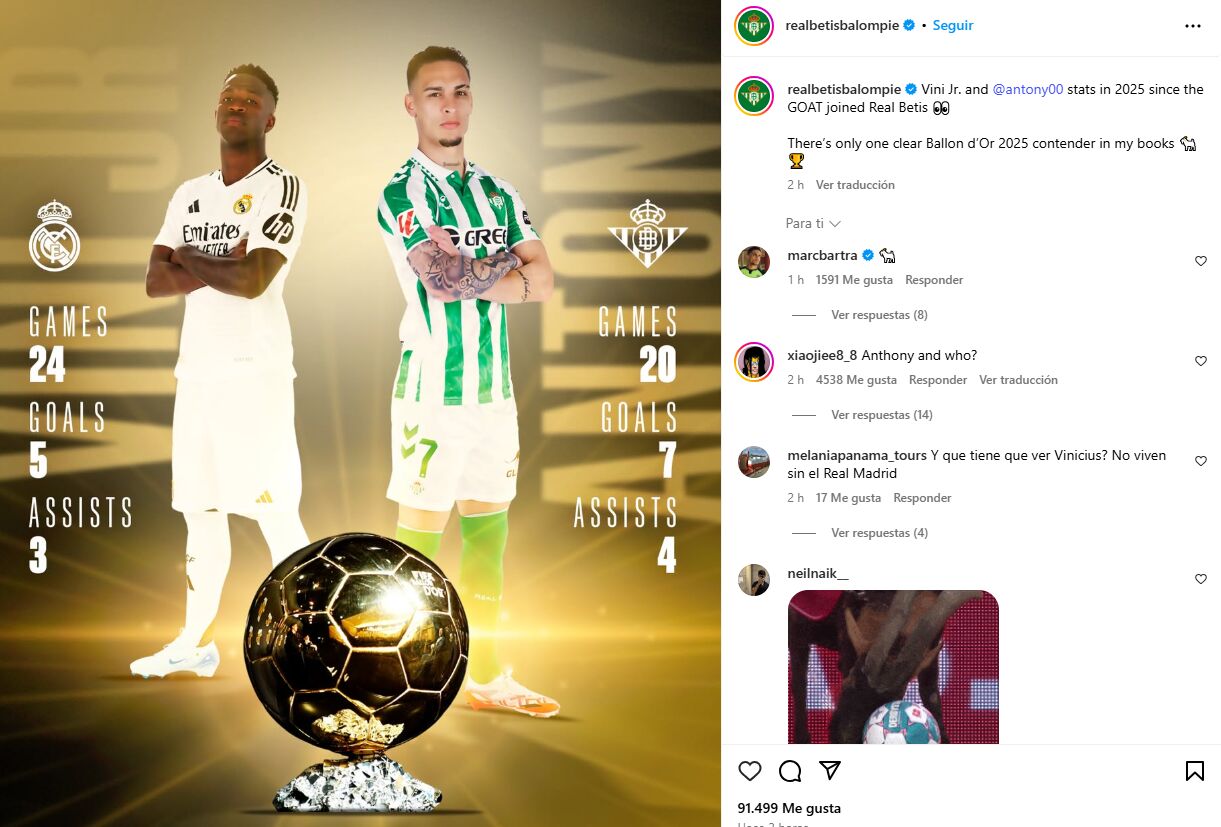 Esta es la publicación del Betis en Instagram comparando a ambos y pidiendo el Balón de Oro para su jugador: