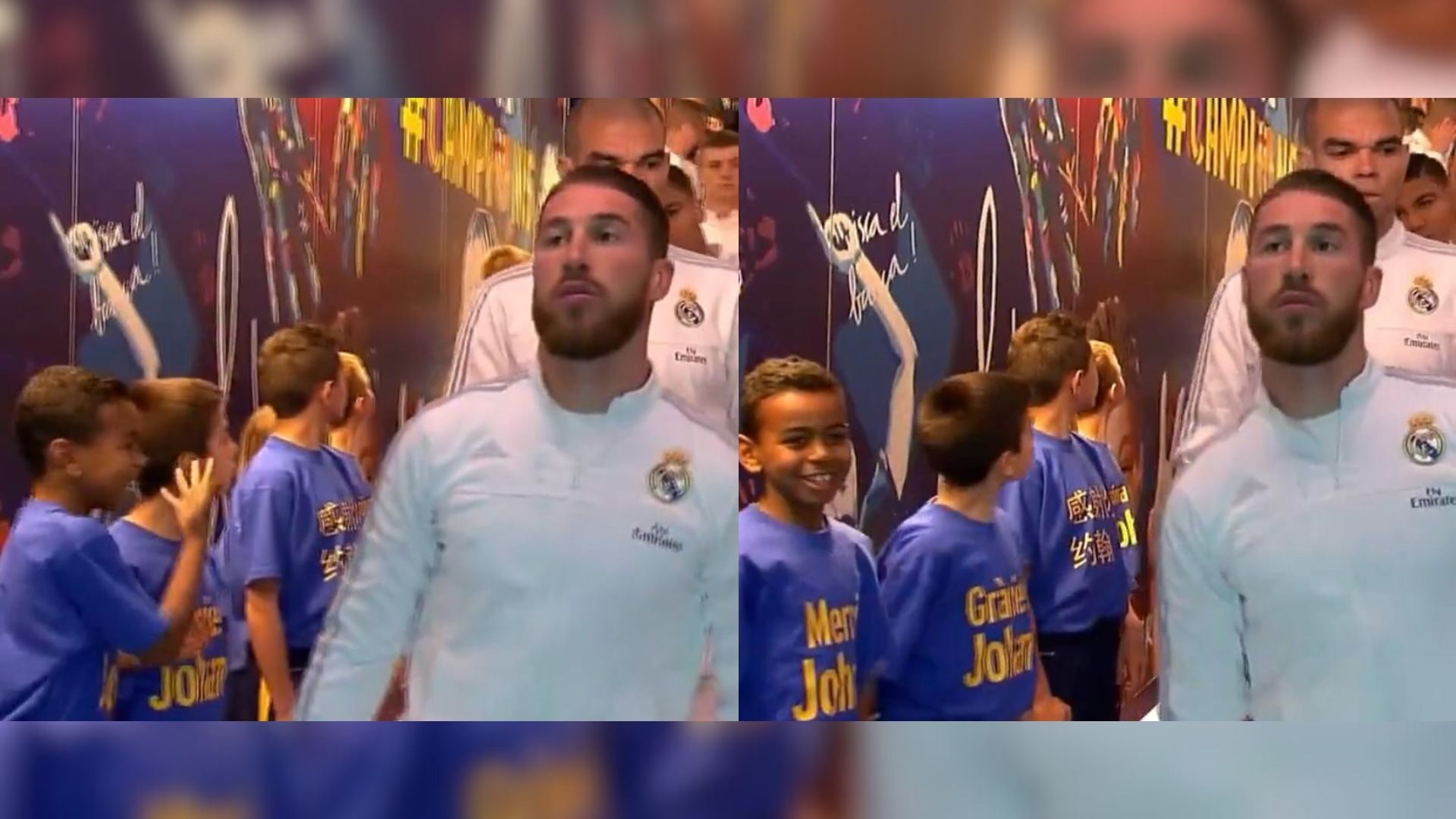 En el vídeo se puede ver a Lamine Yamal buscando en el final de la fila de los jugadores del Real Madrid a alguno de ellos, muchos afirman que se trata de Cristiano Ronaldo. Fuera quien fuese, el pequeño le terminó encontrando, señalando y esbozando una gran sonrisa dentro de la incredulidad de estar viviendo un sueño. Instantes antes de salir al césped, Sergio Ramos le extiende su mano y él la toma feliz.
