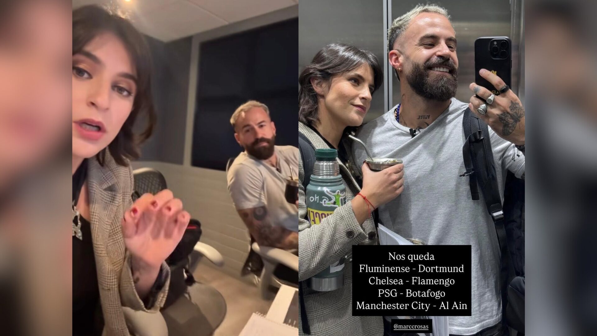 "Termina mi día tras disfrutar de más de 12 horas de fútbol y aprendiendo la definición del verbo "chamuyar". Gracias Mundial de Clubes. Mañana más", escribió el exfutbolista en sus redes sociales. Por su parte, Del Carril subió una foto a sus stories junto a Marc y con el siguiente texto: "Nos queda: Fluminense-Dortmund, Chelsea-Flamengo, PSG-Botafogo y Manchester City-Al Ain". Ambos ya están preparados para vivir las siguientes jornadas.