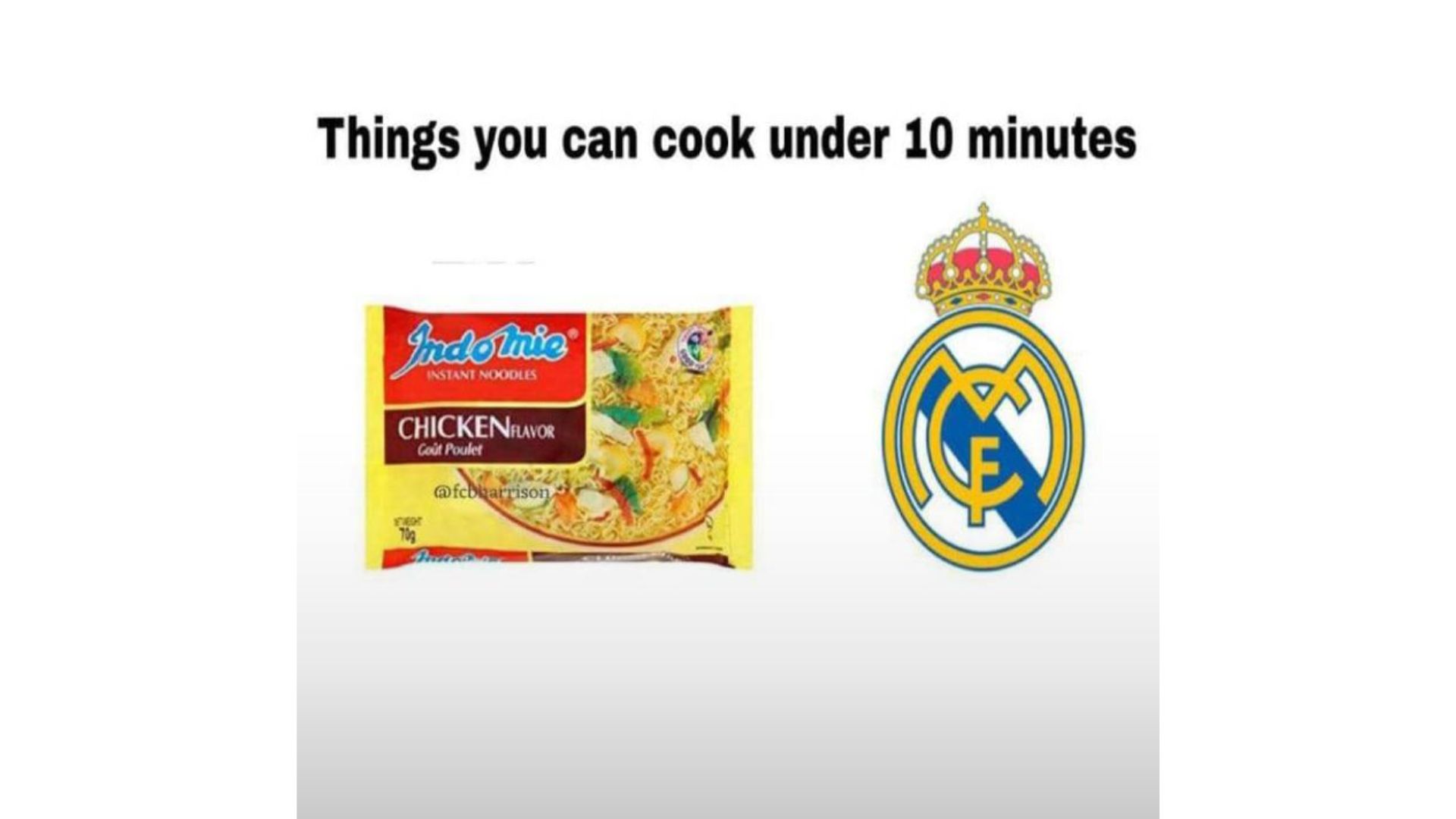 Puesto que el Real Madrid perdía 2-0 ante de llegar al minuto 10 de partido, se recurre a "cosas que se pueden cocinar en menos de 10 minutos" y aparece el escudo junto a unos fideos instantáneos.
