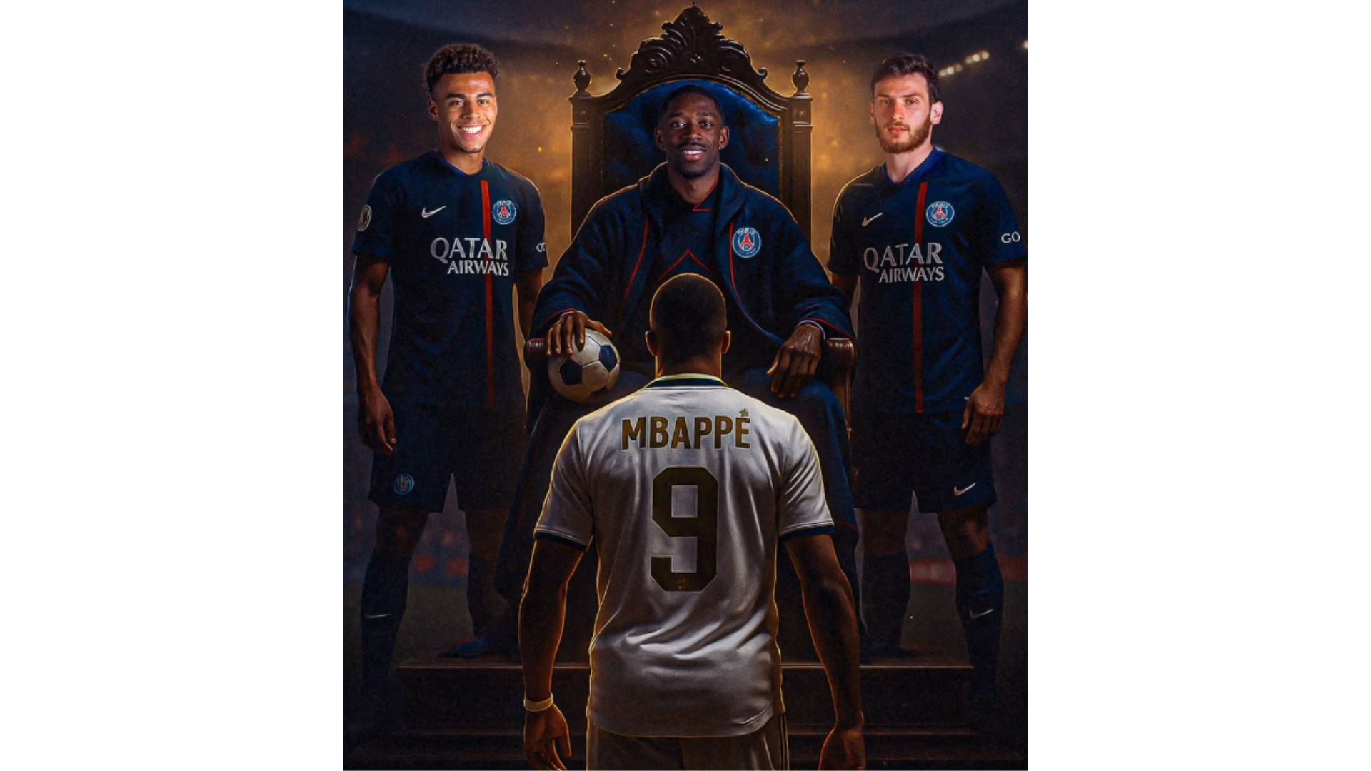 Mbappé solitario frente al trono ocupado por Dembelé y acompañado de Doué y Kvaratskhelia.