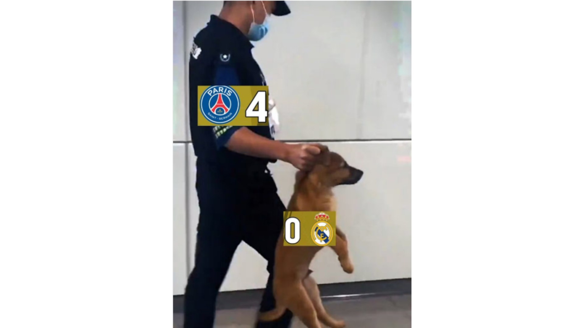 Un policía ejerce el control sobre un perro y lo relacionan con la actitud de superioridad del equipo de Luis Enrique frente a los blancos.