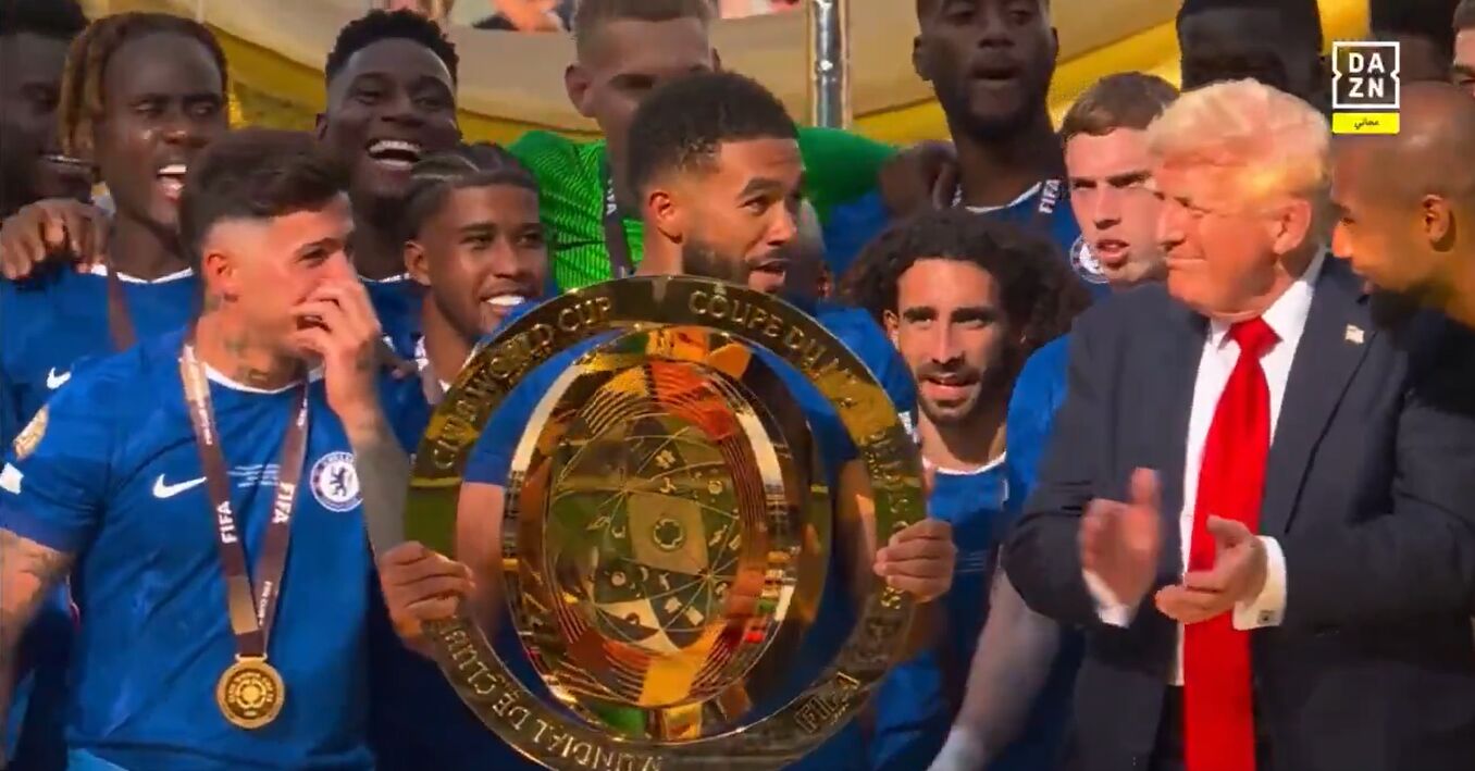 Los jugadores del Chelsea no daban crédito a lo que sucedía. De hecho Reece James, capitán blue, se le quedó mirando esperando a que se marchase para levantar el trofeo al cielo de Nueva York. Trump no se movió y James tuvo que seguir con él al lado.