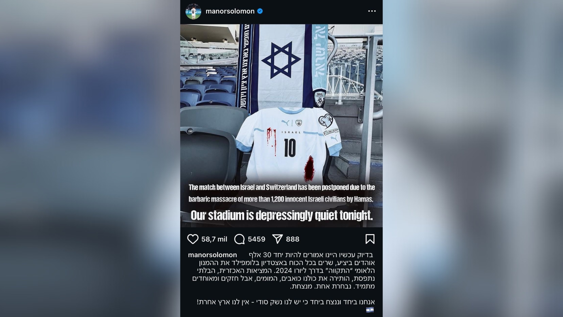 En el pie de foto, Solomon añadió: "Ahora mismo se suponía que estaríamos juntos 30 mil fans en las gradas, cantando con toda la potencia en el estadio de Bloomfield el himno nacional "Esperanza" camino a la Eurocopa 2024. La cruel realidad, inconcebible, nos ha dejado a todos los heridos, aturdidos, pero más fuertes y unidos que nunca. Estamos juntos y vamos a ganar juntos porque tenemos un arma secreta - ¡no tenemos otros país!", junto a una bandera israelí.