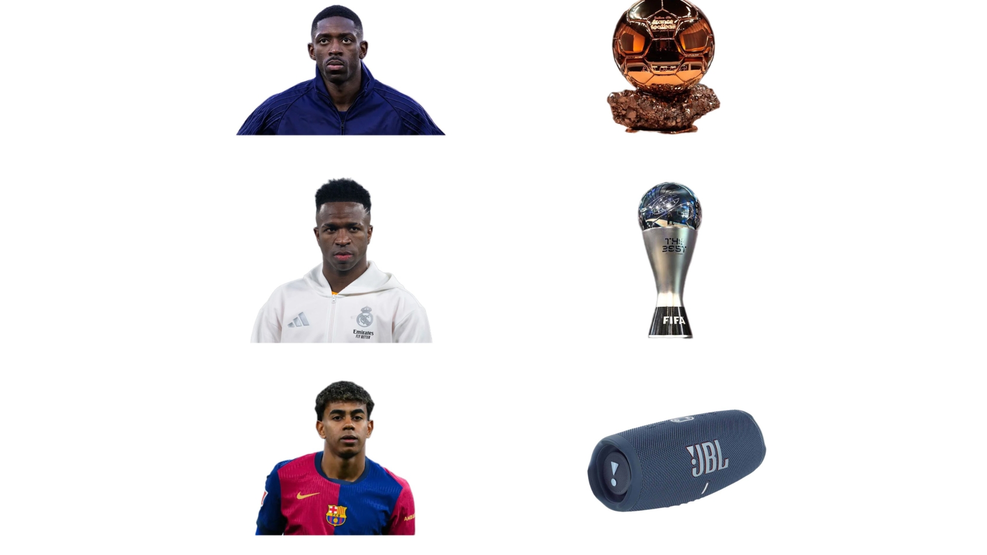 Dembélé consiguiendo el Balón de Oro, Vinícius con el trofeo The Best y Lamine Yamal, un altavoz JBL.