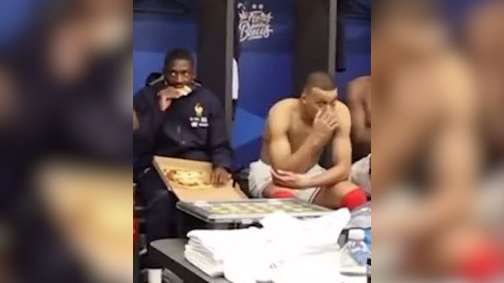 Dembélé, ahora con un Balón de Oro, en el vestuario de la selección francesa comiéndose un pizza sentado al lado de Mbappé.