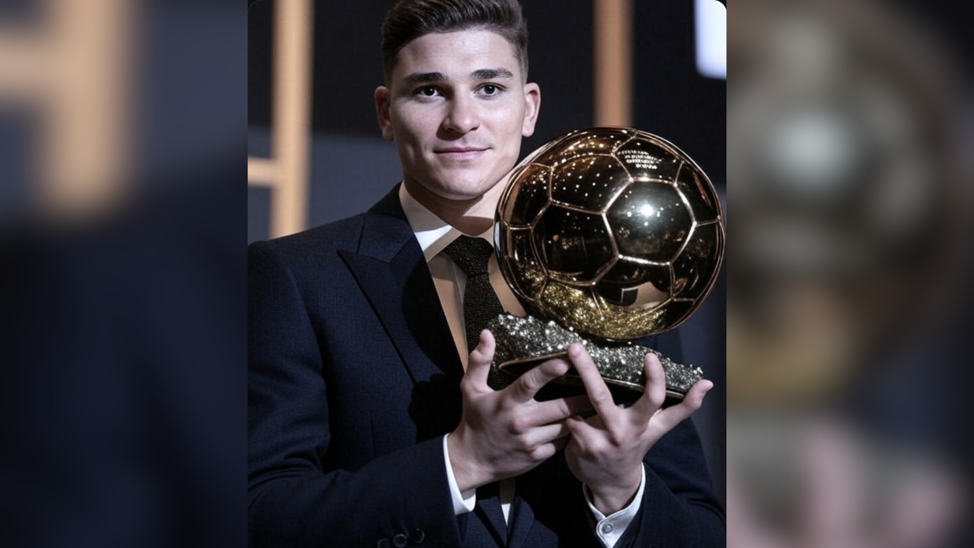 Julián Álvarez en la gala del Balón de Oro. Hace referencia a que en algún momento el delantero argentino también saldrá galardonado con este trofeo.