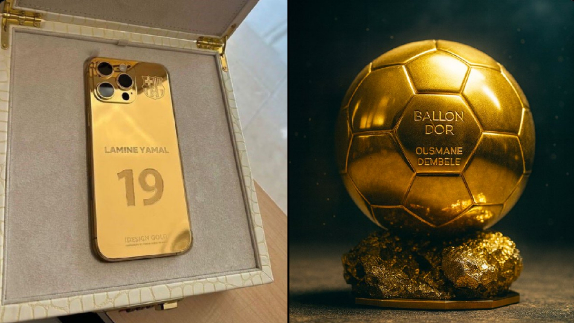 Comparando el logro de Dembélé - Balón de Oro - con el éxito de Lamine Yamal - un iPhone dorado con el escudo del FC Barcelona, su nombre y dorsal 19 -.