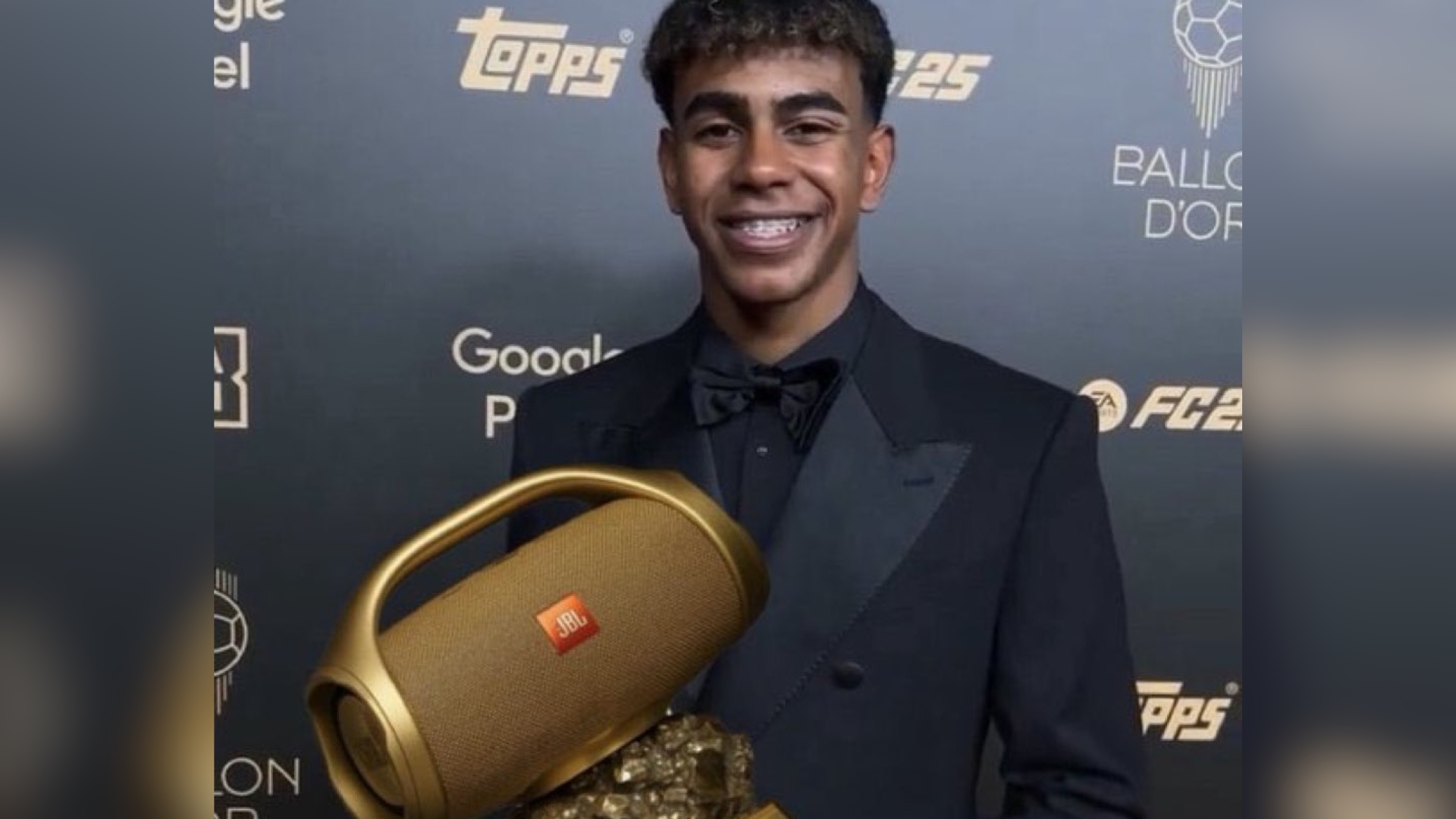 Lamine Yamal saliendo de la gala del Balón de Oro con un altavoz dorado, premio "Bocinero de Oro".