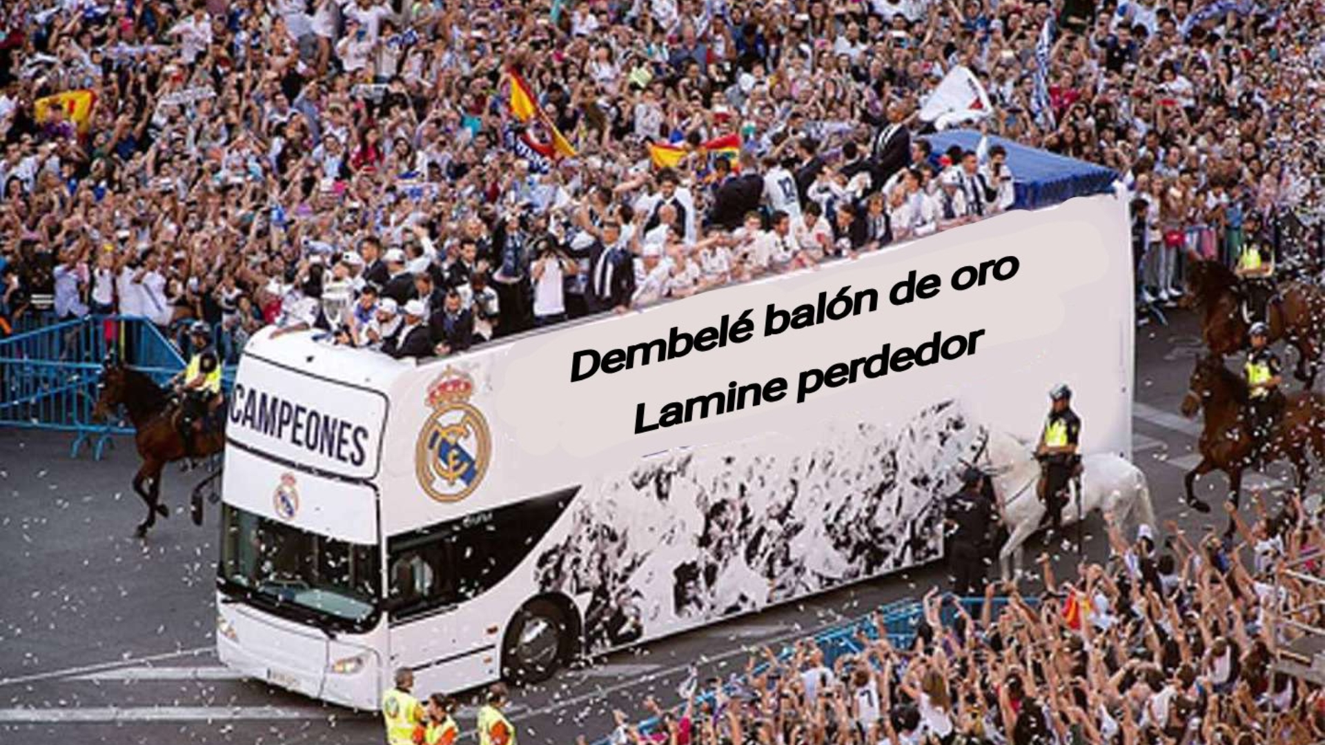 Los jugadores y aficionados del Real Madrid celebrando que Dembelé haya quedado por delante de Lamine Yamal.