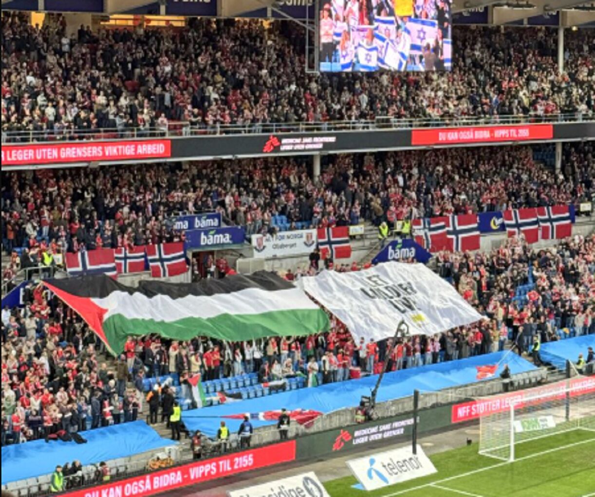 Noruega goleó 5-0 a Israel este fin de semana en un encuentro marcado por el aquelarre anti Israel que tuvo lugar antes, durante y después de este partido. Así estaba la grada antes y durante el partido exhibiendo banderas de Palestina y tarjetas rojas: