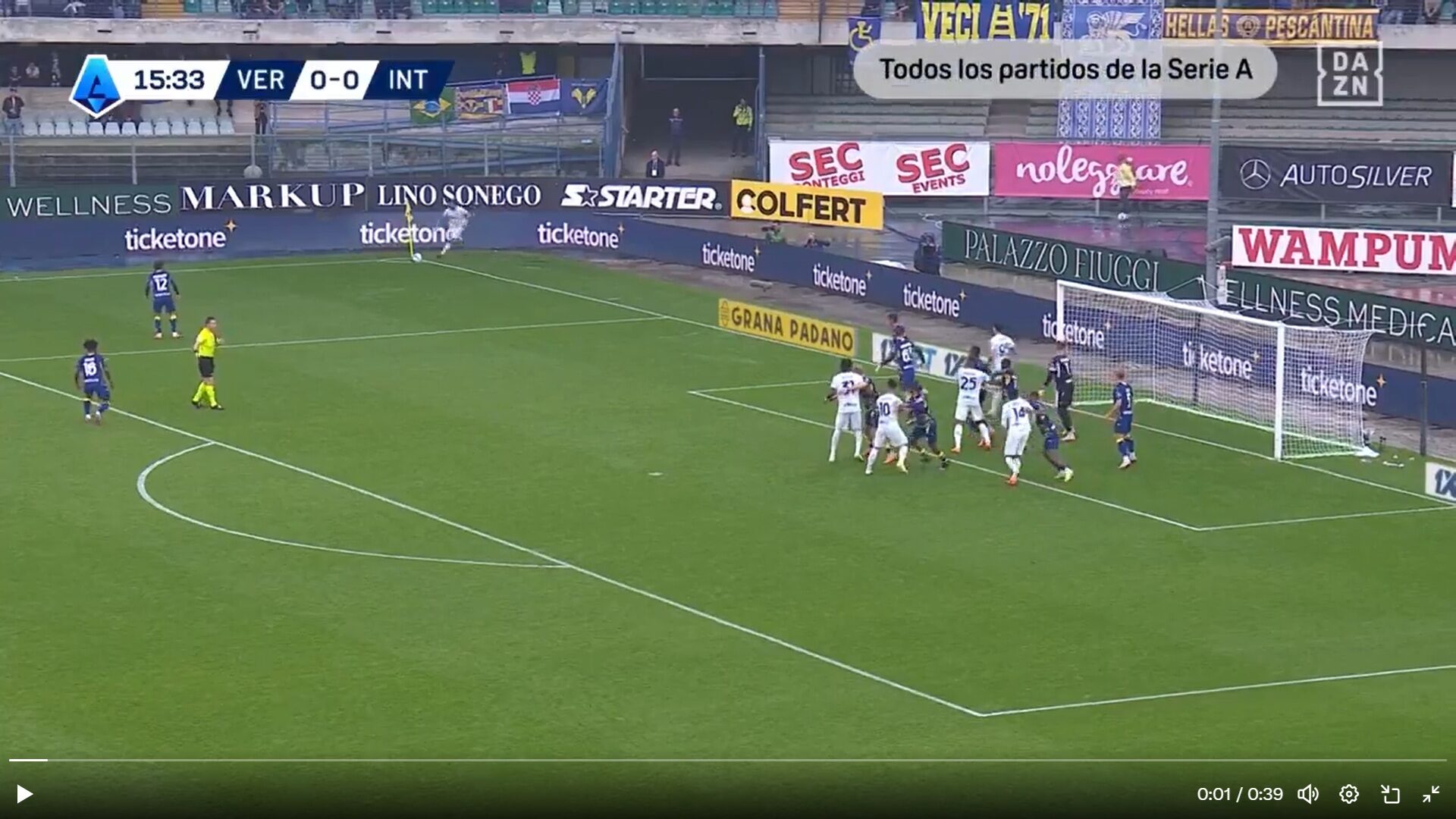 A pesar de que el Hellas Verona empató en el 40 de partido por medio de Santana, el equipo interista se llevó los tres puntos con un tanto en el descuento de Martin Frese.