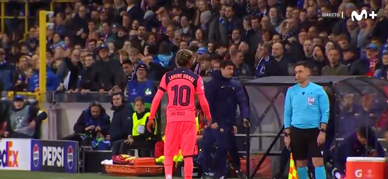 Lamine Yamal se gira hacia el público les hace un gesto de "ven" y luego les manda un beso. Un gesto lamentable que podría haber provocado un problema con la grada de Brujas.