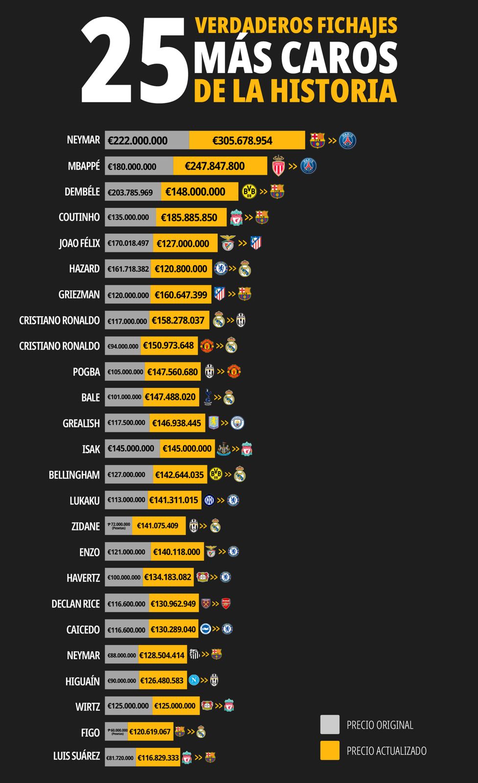 Varios titulares se desprenden de este informe. Por ejemplo, que, a coste actualizado, la salida de Neymar al PSG en 2017 costaría, actualmente, 305 millones de euros. En aquel momento los franceses se gastaron 222 millones de euros. Seguiría siendo el fichaje más caro de la historia pero, aplicada esta fórmula matemática, resulta el único fichaje que estaría por encima de los 300 millones de euros.