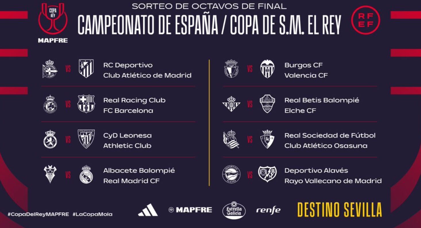 Los octavos de final de la Copa del Rey, los próximos 13, 14 y 15 de enero a único partido, enfrentarán a los dos líderes de Primera, el Barcelona, y Segunda, el Racing de Santander, en El Sardinero, llevarán al Real Madrid hasta Albacete, con el aviso de la eliminación del Celta en la ronda anterior, y desafiarán al Atlético de Madrid en Riazor contra el Deportivo de La Coruña, con el que nunca perdió en el torneo.