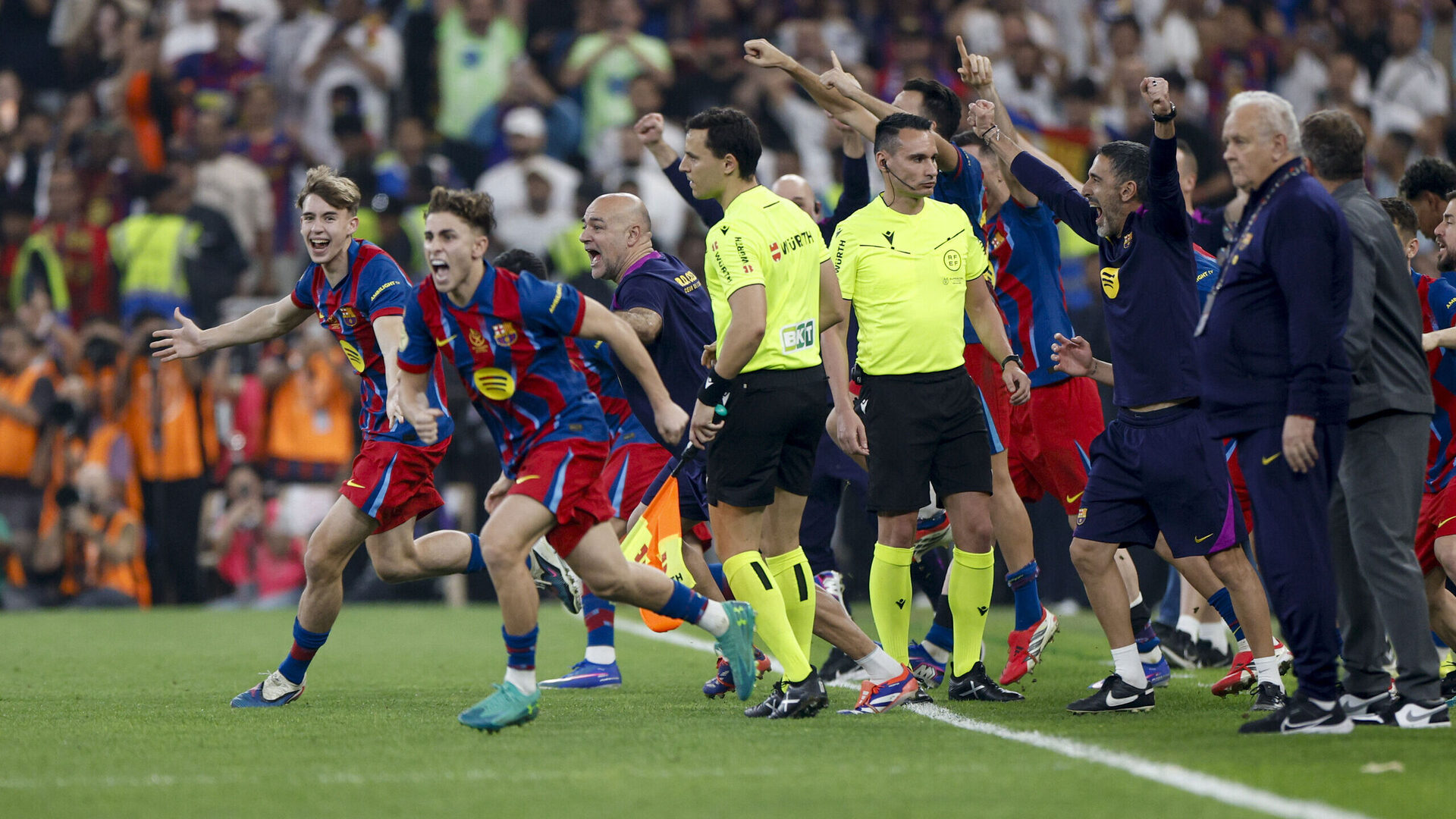Dos canteranos culés, Pau Cubarsí y Fermín, fueron protagonistas sobre el césped en dos acciones cargadas de polémica. Munuera Montero señaló el final del partido y el FC Barcelona se proclamó campeón de la Supercopa de España. Acto seguido, los jugadores culés del banquillo salieron efusivos a celebrar junto al resto de compañeros que se encontraban en el terreno de juego.