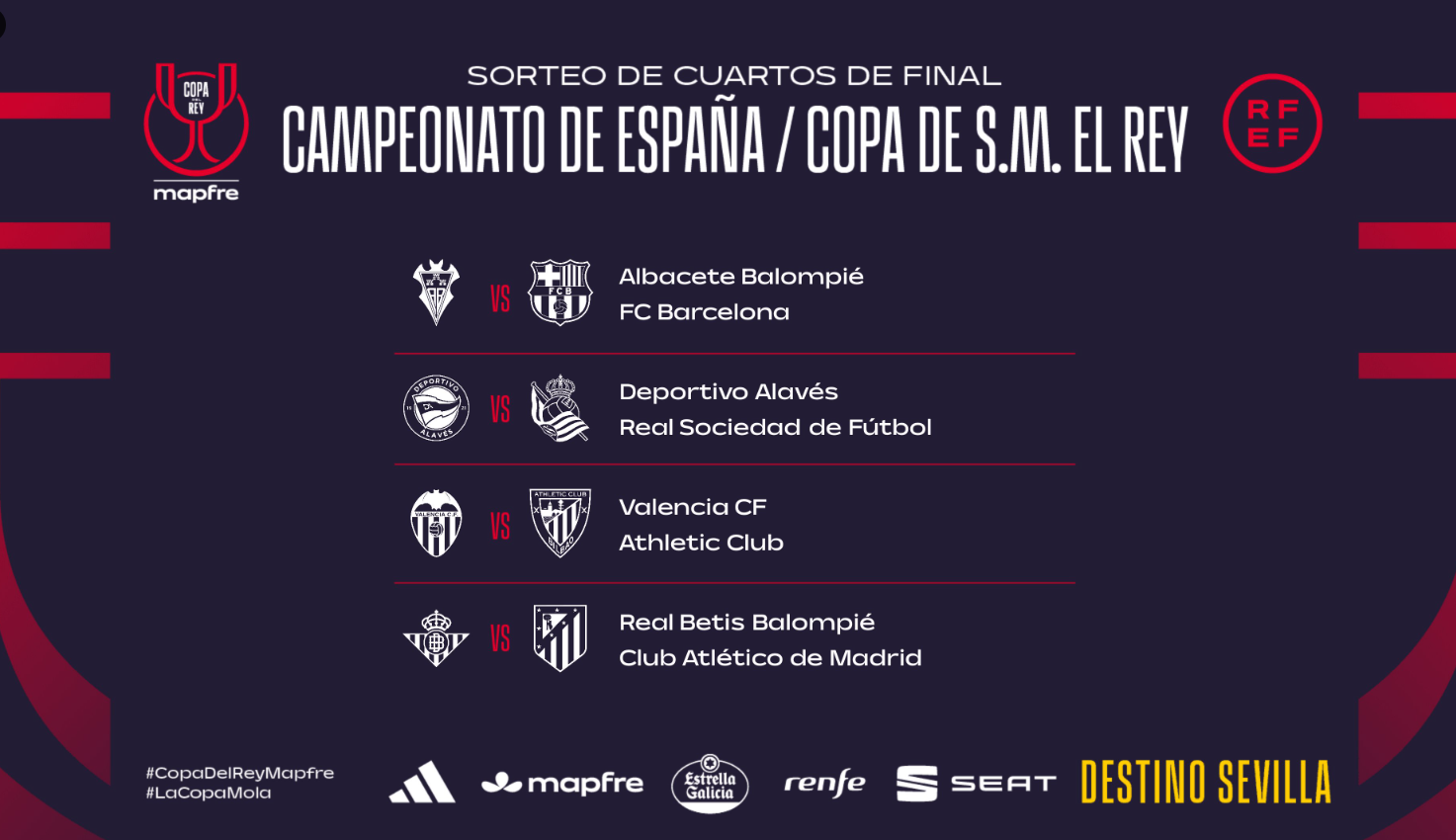 Albacete-Barcelona, Alavés-Real Sociedad, Valencia-Athletic Club de Bilbao y Betis-Atlético de Madrid son los enfrentamientos de cuartos de final de la Copa del Rey, según deparó el sorteo celebrado este lunes en la Ciudad del Fútbol de Las Rozas.