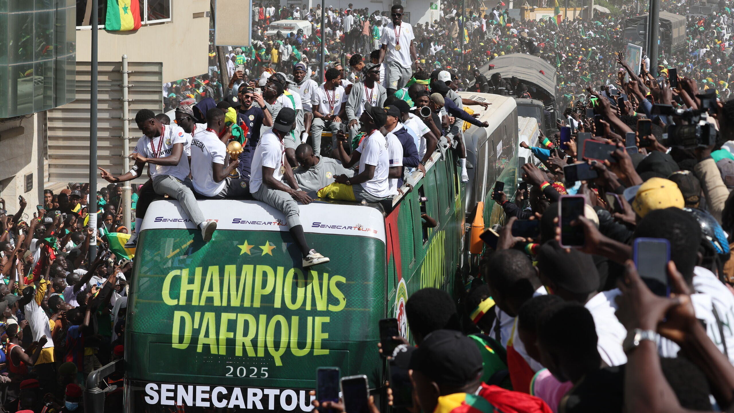La celebración, con Sané encabezando, discurrió por las calles de la capital senegalesa en un autobús descapotable diseñado con los colores nacionales (verde, rojo y amarillo). Al paso de los campeones, los aficionados mostraron su efusividad y alegría después de haber conseguido imponerse a Marruecos en la final cantando y bailando al ritmo de tambores nacionales.