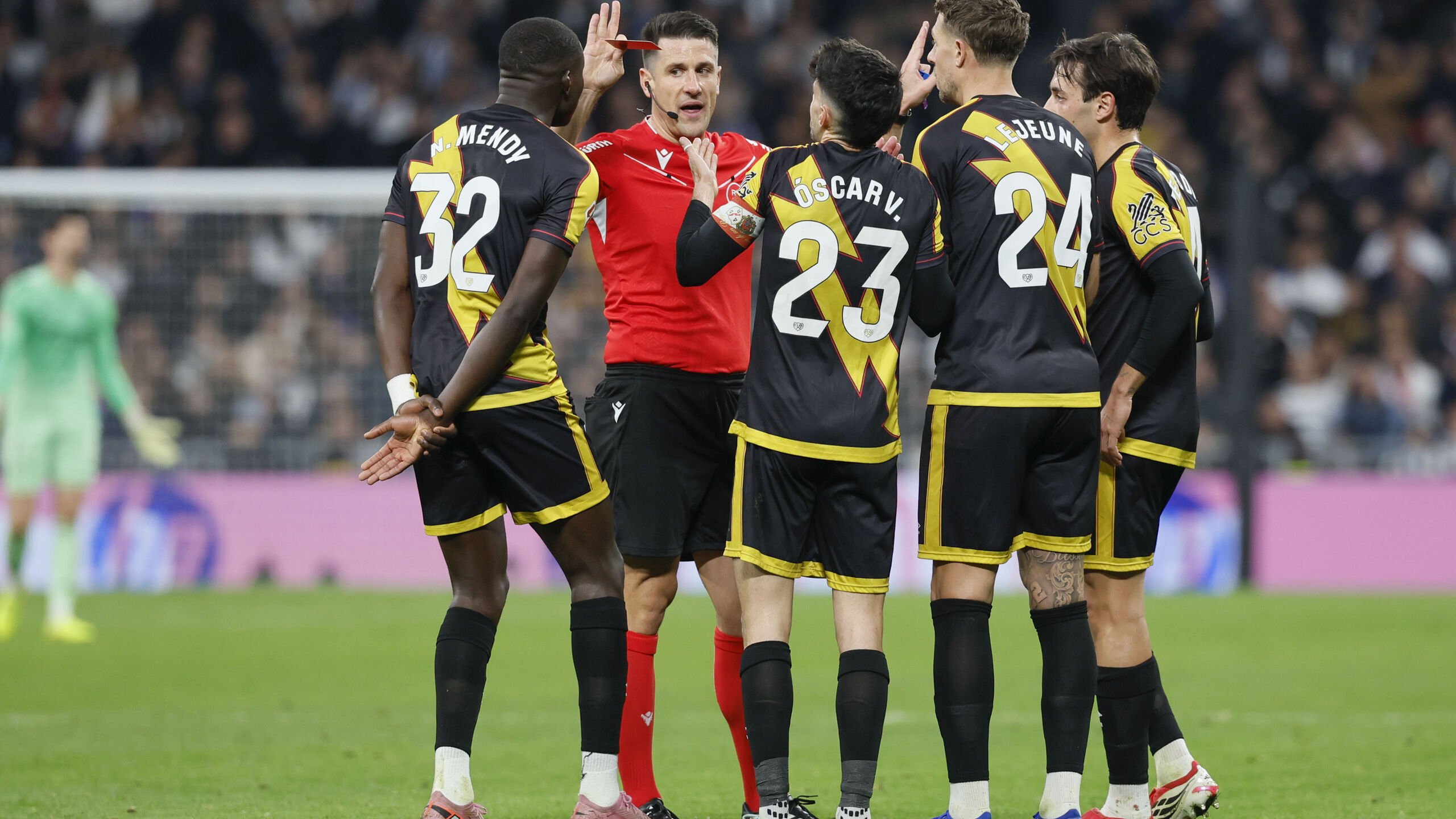 El Real Madrid se enfrentó al Rayo Vallecano en el Santiago Bernabéu y consiguió llevarse los tres puntos con un tanto de Mbappé en el minuto 100 de partido (2-1). La plantilla de Vallecas, junto con el resto de integrantes del club, terminó muy molesta con la actuación del árbitro. El conjunto terminó con dos futbolistas expulsados y el penalti señalado sobre Brahim se produjo cuando el Rayo estaba a escasos segundos de puntuar.