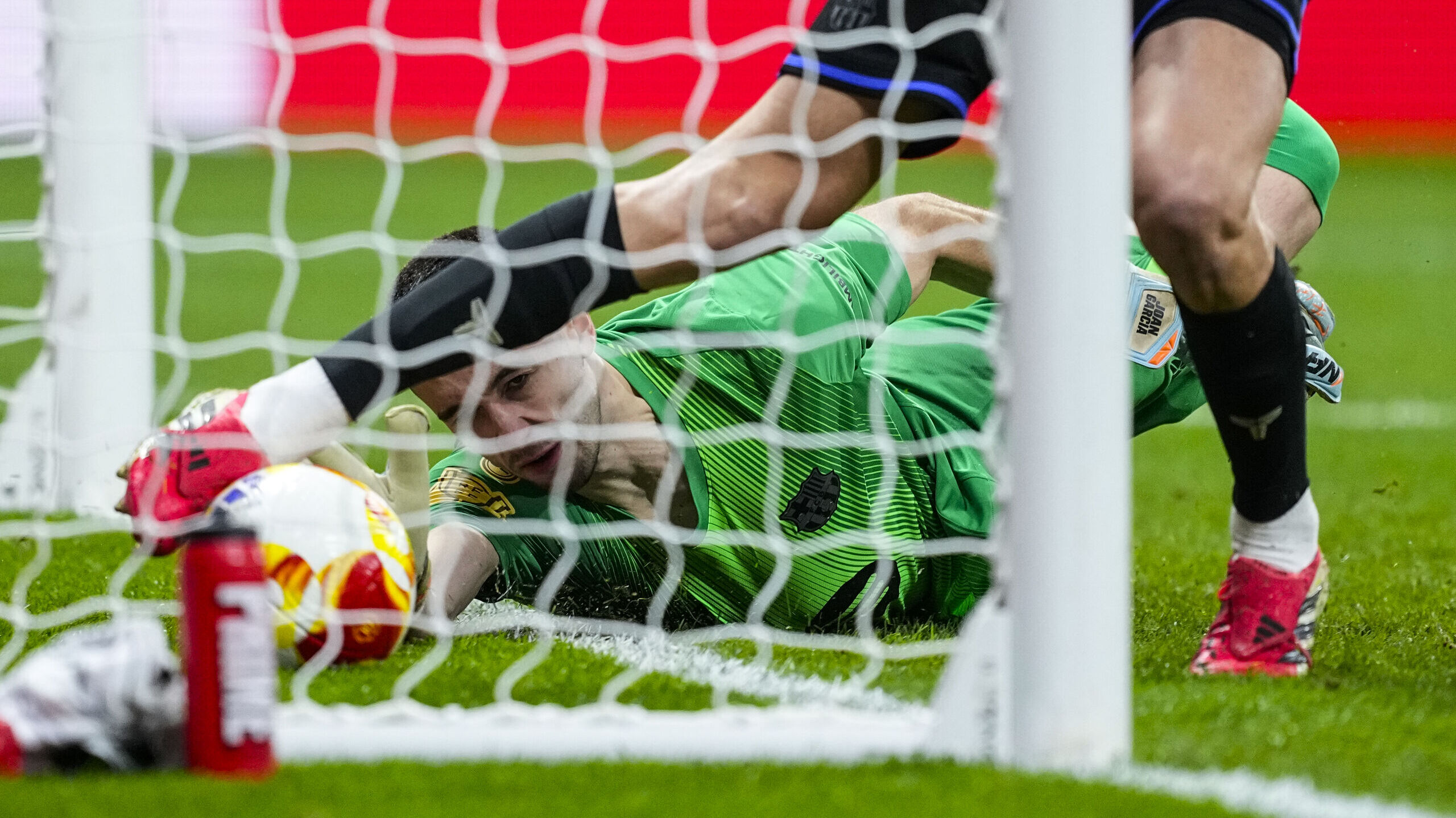 Era un pase, a priori, sin problemas, pero que se terminó complicando. El portero intentó salvar el primer tanto del Atlético de Madrid realizando una gran carrera hacia la portería, pero el balón terminó pasando la línea de cal.
