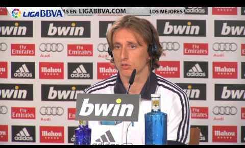 El futbolista croata Luka Modric ofrece su primera rueda de prensa como jugador del Real Madrid. Espera ganar muchos títulos con el club del Santiago Bernabéu.