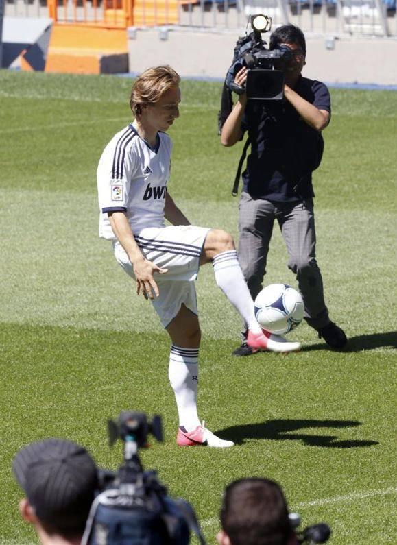 Luka Modric ya ejerce como madridista. Primero era presentado ante la afición sobre el césped del Santiago Bernabéu, donde ha vestido de blanco con el dorsal número 19 a la espalda –uno de los tres que quedaban libres junto al 16 y 23–, y luego ante los medios de comunicación en la sala de prensa del estadio.