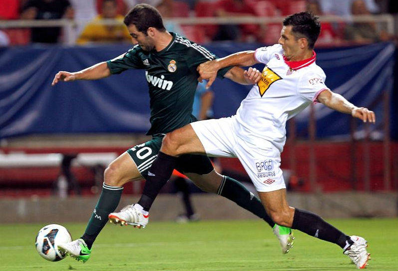 Tremendo golpe para el campeón, que se presentaba en el césped con la novedosa camiseta verde. Pero pudo ser aún peor porque el Sevilla seguía llegando con peligro al área de Casillas mientras se empleaba con muchísima dureza, como demostró Fernando Navarro con una entrada a Higuaín sin ton ni son cuando sólo se llevaban tres minutos de partido.