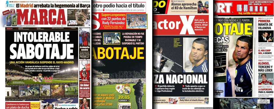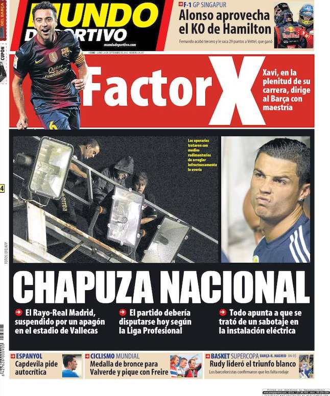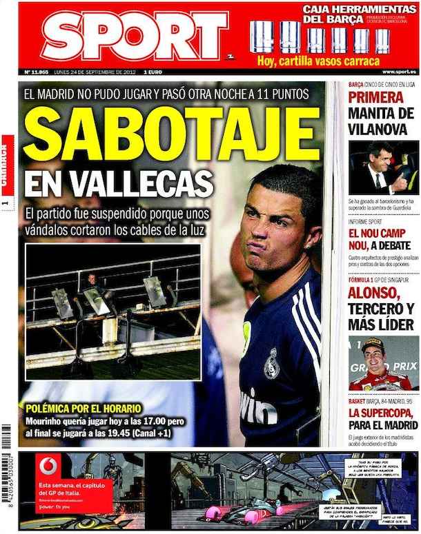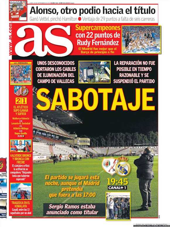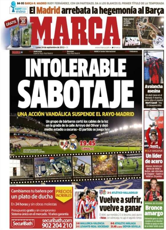 Los periódicos deportivos destacan en sus portadas el sabotaje en el estadio de Vallecas, con unos vándalos cortando los cables de iluminación y obligando a suspender el partido Rayo Vallecano-Real Madrid.
