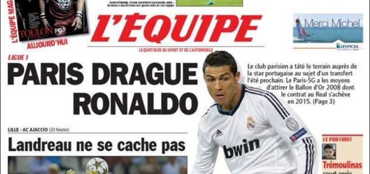 El diario francés L´Equipe lleva este sábado a su portada el interés del Paris Saint Germain en hacerse con los servicios de Cristiano Ronaldo: "Paris coquetea con Ronaldo", es su titular.