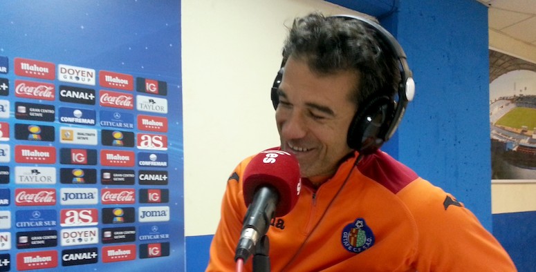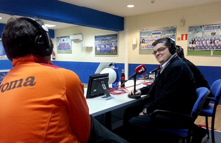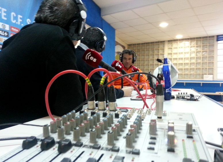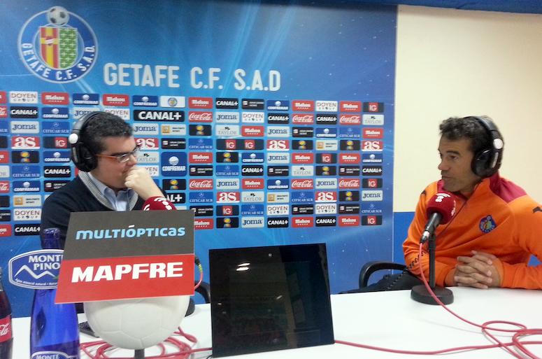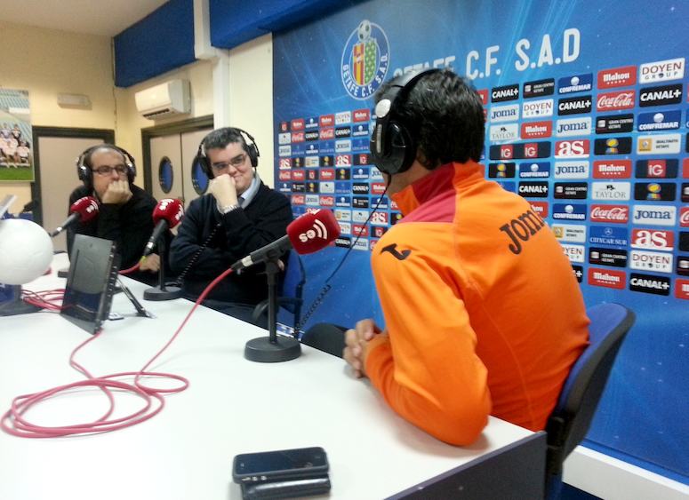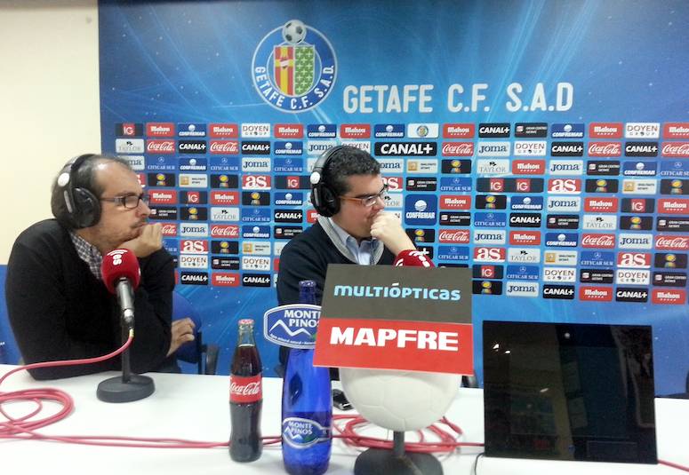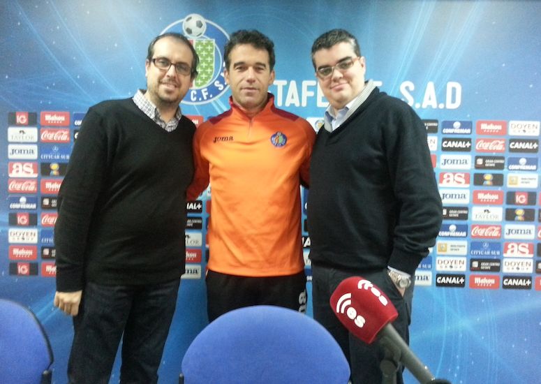 Vicente Azpitarte, director y presentador de Tiempo Extra, y Dani Blanco entrevistan para esRadio al entrenador del Getafe, Luis García Plaza, en la sala de prensa del Coliseum con la realización técnica de Faustino Aliseda.