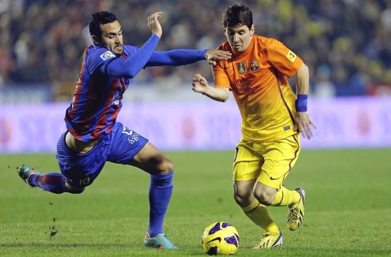 Aunque era el Barça el que llevaba la voz cantante, el Levante supo jugarle sus armas al equipo de Vilanova, tratando de sorprenderlo al contragolpe. A la media hora, Juanlu llevó zozobra a la zaga visitante tras hacerle un caño a Piqué y habilitar a Barkero, cuyo remate a la media vuelta se marchó a las nubes. Minutos después fue Martins quien tuvo una buena oportunidad con un cabezazo a pocos metros de la portería, y completamente solo, que salió desviado. La réplica la puso Piqué, al filo de descanso, con un remate con la testa que se marchó por varios metros.